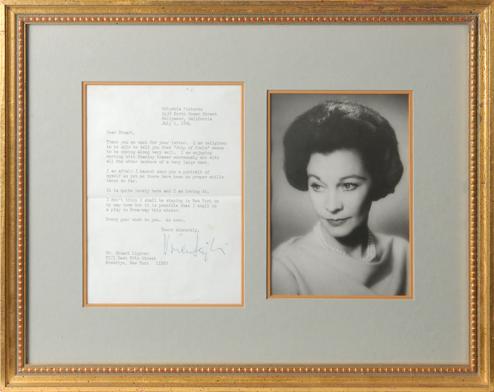 TLS, one page, 5.25 x 7.5, July 1, 1964. Letter to Stuart Lippner, in full: “Thank you so much for your letter. I am delighted to be able to tell you that ‘Ship of Fools’ seems to be coming along very well. I am enjoying working with Stanley Kramer enormously and with all the other members of a very large cast. I am afraid I cannot send you a portrait of myself as yet as there have been no proper stills taken so far. It is quite lovely here and I am loving it. I don’t think I shall be staying in New York on my way home but it is possible that I shall do a play on Broadway this winter. Every good wish to you.” Double-matted and framed with a portrait of Leigh to an overall size of 17 x 13.25. In fine condition, with a small light stain above the signature. Ship of Fools was Leigh’s final motion picture. Pre-certified PSA/DNA.