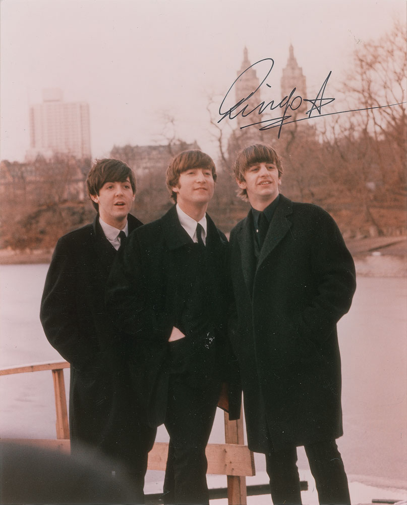Color glossy 8 x 10 photo of Paul McCartney, John Lennon, and Ringo Starr posing in New York’s Central Park in 1964, signed in thin black felt tip, “Ringo,” adding a large star. In fine condition. Pre-certified REAL.