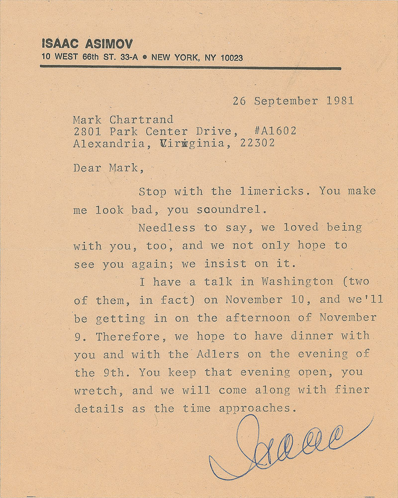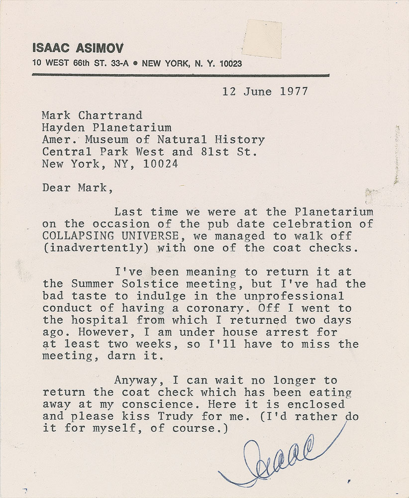 Three TLSs, each signed “Isaac,” one page, approximately 5.75 x 7, personal letterhead. Each letter is addressed to Mark Chartrand, the director of the American Museum of Natural History’s Hayden Planetarium. The first letter, dated June 12, 1977, in part: “Last time we were at the Planetarium on the occasion of the pub date celebration of Collapsing Universe, we managed to walk off (inadvertently) with one of the coat checks. I’ve been meaning to return it at the Summer Solstice meeting, but I’ve had the bad taste to indulge in the unprofessional conduct of having a coronary…I am under house arrest for at least two weeks, so I’ll have to miss the meeting, darn it”; another, dated June 23, 1977, in part: “These days, however, I am finding it difficult to concentrate on anything but what the doctor will say (I’m seeing him in a couple of hours.) Assuming he gives me a good report on progress I fully intend to be at the Institute on Man and Science where I do plan to be on the stage with you and Ben”; and the last, from September 26, 1981, in part: “Stop with the limericks. You make me look bad, you scoundrel…I have a talk in Washington (two of them, in fact) on November 10, and we’ll be getting in on the afternoon of November 9. Therefore, we hope to have dinner with you and the Adlers.” In overall fine condition, with a small piece of tape, and a small area of tape-related surface loss to the earliest letter. Pre-certified PSA/DNA.