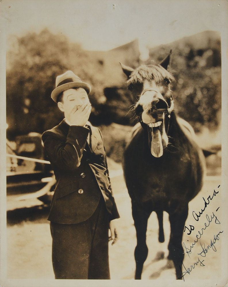 American actor and comedian (1884–1944) whose best work rivaled that of Charlie Chaplin, Harold Lloyd, and Buster Keaton; he is best remembered for the films The Strong Man, Tramp, Tramp, Tramp, and Long Pants. Scarce vintage matte-finish 8 x 10 photo of Langdon sharing a laugh with a horse, signed and inscribed in fountain pen, “To Audra—Sincerely—Harry Langdon.” In fine condition, with tack holes to corners. Pre-certified PSA/DNA.