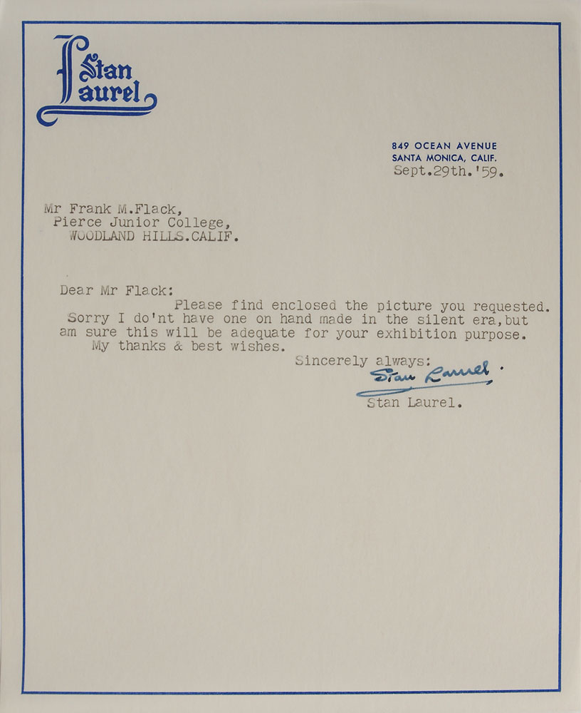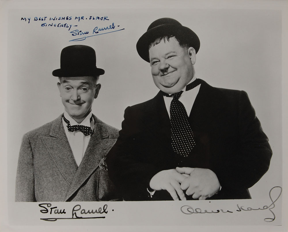 Two items: a glossy 10 x 8.25 photo of Laurel and Hardy posing side-by-side in their bowler hats above a pair of signatures inherent to the original image, signed and inscribed in fountain pen, “My best wishes Mr. Flack, Sincerely—Stan Laurel”; and a TLS signed “Stan Laurel,” one page, 8 x 10, personal letterhead, September 29, 1959, in full: “Please find enclosed the picture you requested. Sorry I don’t have one on hand made in the silent era, but am sure this will be adequate for your exhibition purpose. My thanks & best wishes.” In fine condition. Accompanied by the original mailing envelope, with Laurel adding in his own hand, “Photograph. Please don’t fold or bend.” Pre-certified PSA/DNA.