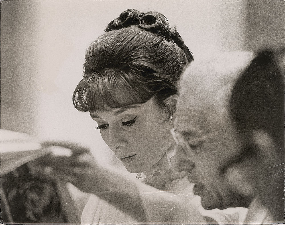 Two vintage silver gelatin photos: a glossy 9.25 x 7.5 photo of Hepburn during the production of My Fair Lady, bearing an Alan T. Band credit stamp and affixed caption on the reverse; and a glossy 8 x 10 photo of the fashionable actress wearing big sunglasses in the 1967 film Two for the Road, bearing an Anthony J. Corso credit stamp on the reverse. In overall very good condition, with several noticeable creases to both. From the Globe Photo archives.
