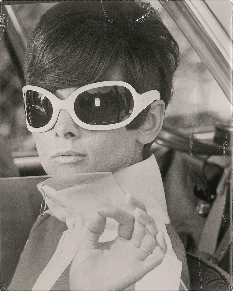 Two vintage silver gelatin photos: a glossy 9.25 x 7.5 photo of Hepburn during the production of My Fair Lady, bearing an Alan T. Band credit stamp and affixed caption on the reverse; and a glossy 8 x 10 photo of the fashionable actress wearing big sunglasses in the 1967 film Two for the Road, bearing an Anthony J. Corso credit stamp on the reverse. In overall very good condition, with several noticeable creases to both. From the Globe Photo archives.