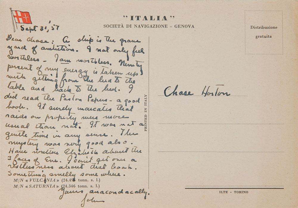 ALS signed “John,” one page on a color 5.75 x 4 postcard depicting a ship, September 30, 1957. Letter to Chase Horton, in full: “A ship is the grave yard of ambition. I not only feel worthless, I am worthless. Ninety percent of my energy is taken up with getting from the bed to the table and back to the bed. I did read The Paston Papers, a good book. It surely indicates that raids on property were more usual than not. It was not a gentle time in any sense. The mystery was very good also. Have written Elizabeth about the 3 faces of Eve. I can’t get over a restlessness about that book. Something smelly some where.” In fine condition. A fabulous, quotable letter from the great American scribe. Pre-certified PSA/DNA.