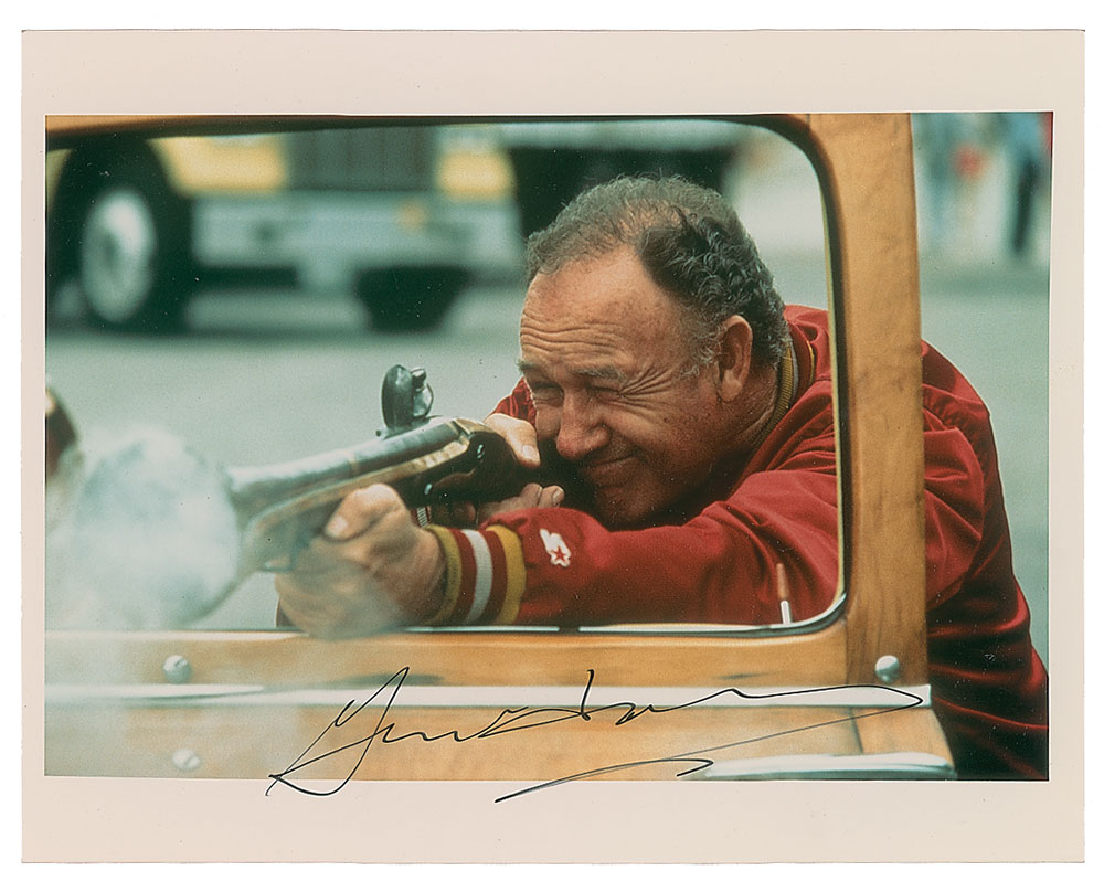 Color glossy 10.25 x 8 photo of Hackman firing a gun in the 1990 film Loose Cannons, signed in black felt tip. In fine condition. Pre-certified PSA/DNA.
