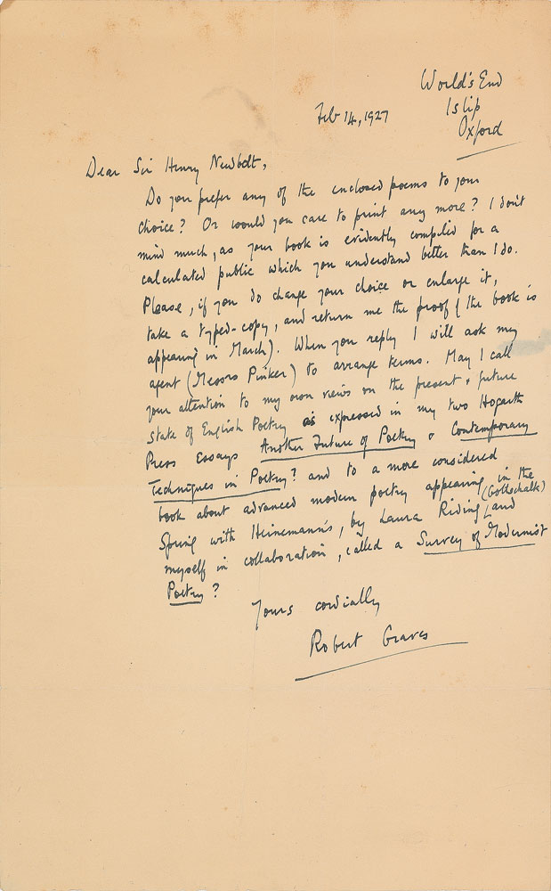 English poet, translator, and novelist (1895–1985). ALS, one page, 8 x 13, February 14, 1927. Letter to fellow poet Henry Newbolt. In part: “Do you prefer any of the enclosed poems to your choice? Or would you care to print any more? I don’t mind much, as your book is evidently compiled for a calculated public which you understand better than I do…May I call your attention to my own views on the present & future state of English Poetry as expressed in my two Hogarth Press essays Another Future of Poetry & Contemporary Techniques in Poetry?” In fine condition, with some very staining along the top. Pre-certified PSA/DNA.