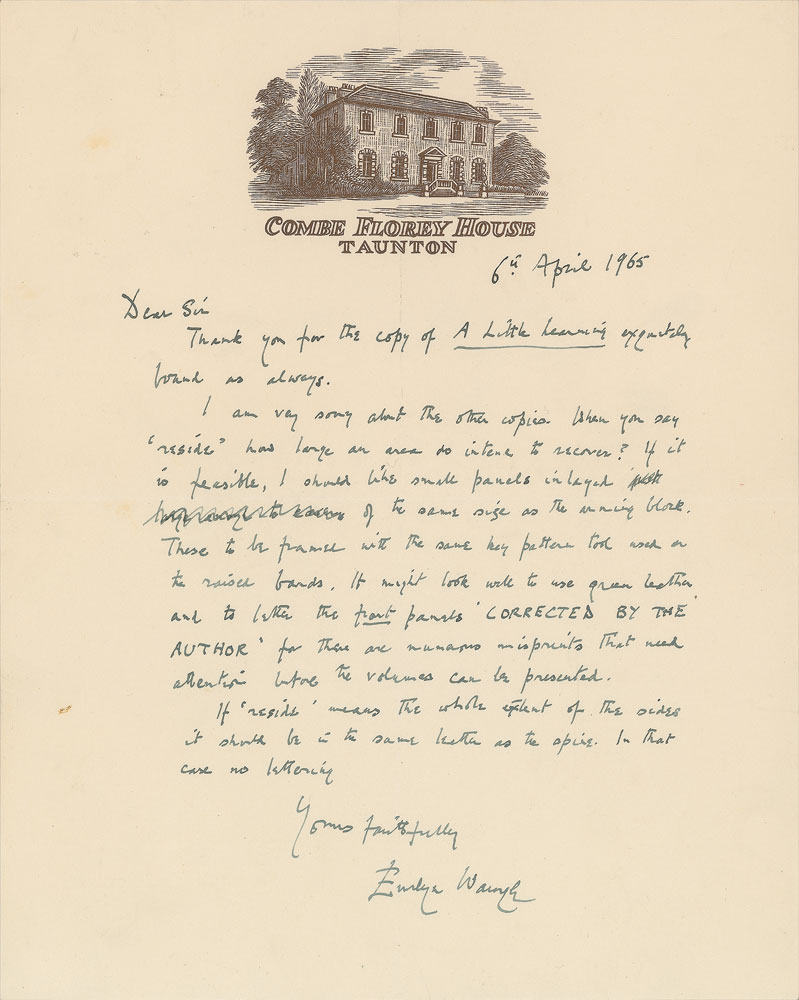 Uncommon ALS, one page, 8 x 10, Combe Florey House letterhead, April 6, 1965. Interesting letter to a bookbinder. In part: “Thank you for the copy of A Little Learning exquisitely bound as always. I am very sorry about the other copies. When you say ‘reside’ how large an area do you intend to recover? If it is feasible, I should like small panels inlayed…These to be framed with the same key pattern tool used on the raised bands. It might took well to use green leather and to letter the front panels ‘Corrected by the Author’ for there are numerous misprints that need attention before the volumes can be presented. If ‘reside’ means the whole extent of the sides it should be in the same leather as the spine. In that case no lettering.” In fine condition, with a light diagonal crease to the upper left corner. Pre-certified PSA/DNA.