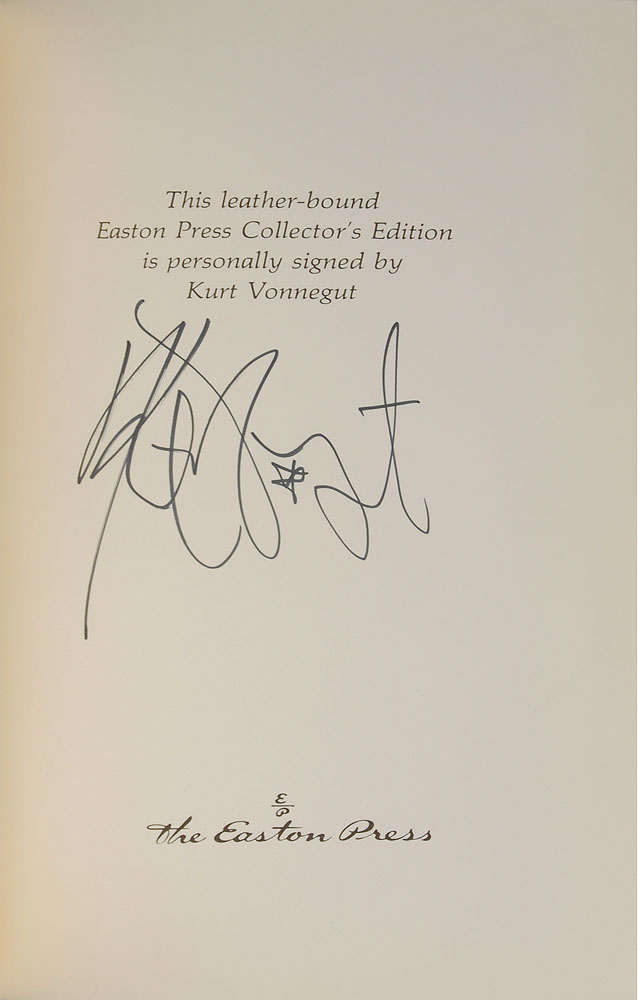 Signed book: The Sirens of Titan. Collector’s edition. Norwalk, Connecticut: The Easton Press, 1990. Leatherbound hardcover, 5.75 x 8.75, 315 pages. Signed on the colophon in black ink. In very fine condition. Pre-certified PSA/DNA.