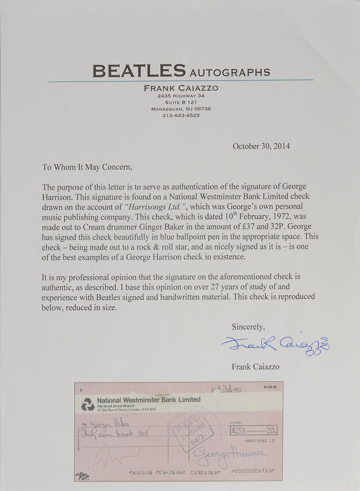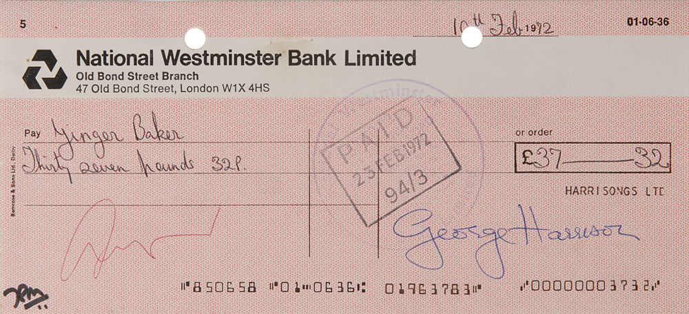 Harrisongs Ltd. check, 7.75 x 3.5, filled out in another hand and signed by Harrison, "George Harrison," payable to Cream drummer Ginger Baker for £37.32, February 10, 1972. In fine condition. Accompanied by a letter of authenticity from noted Beatles expert Frank Caiazzo, in part: "This check-being made out to a rock & roll star, and as nicely signed as it is-is one of the best examples of a George Harrison check in existence." Baker played the drums for Harrison's song 'I Remember Jeep' on All Things Must Pass, and Harrison played rhythm guitar for Cream's 'Badge' in 1969. A unique connection between two great British rock musicians. Pre-certified REAL.