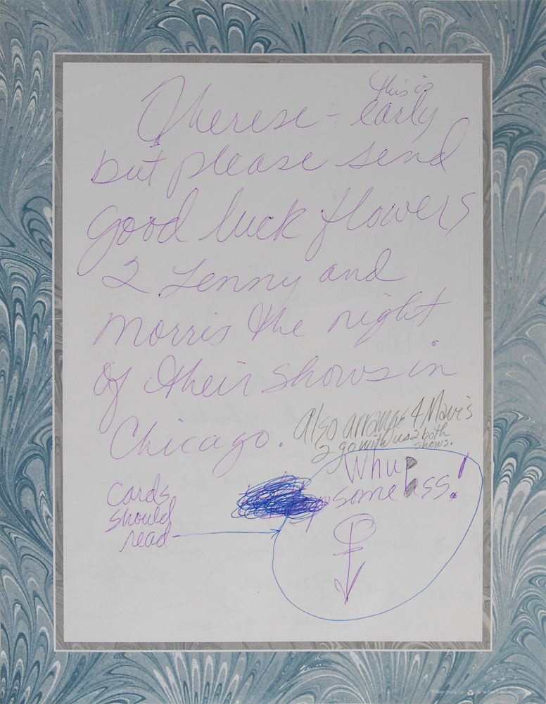 Handwritten note signed with his 'Prince' symbol, one page, 8.5 x 11, no date. Note to his assistant asking that she send flowers to Lenny Kravitz and Morris Day, also mentioning Mavis Staples. In full: "Therese-this is early but please send good luck flowers 2 Lenny and Morris the night of their shows in Chicago. Also arrange 4 Mavis 2 go with us 2 both shows. Cards should read-Whup some ass! " Also bears notes on the reverse in another hand. In fine condition. From the collection of Prince’s assistant Therese Stoulil, who notes that Prince and Mavis Staples attended both shows. An uncommon piece providing several ideal musical connections. Accompanied by a letter of provenance from Therese Stoulil. Pre-certified REAL.