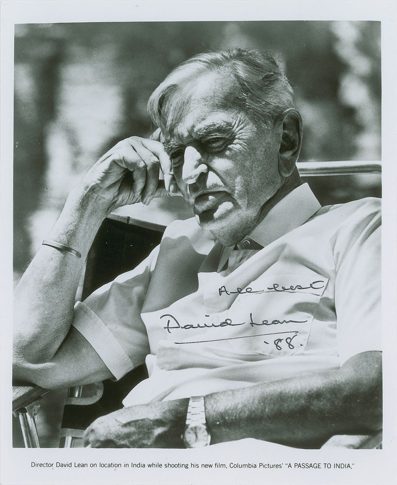 Glossy 8 x 9.75 Columbia Pictures publicity photo of Lean on the set of the 1984 film A Passage to India, signed in black felt tip, “All best, David Lean, ‘88.” In fine condition, with scattered light creases and surface impressions. Lean was nominated for a Best Director Oscar for the film. Pre-certified PSA/DNA.