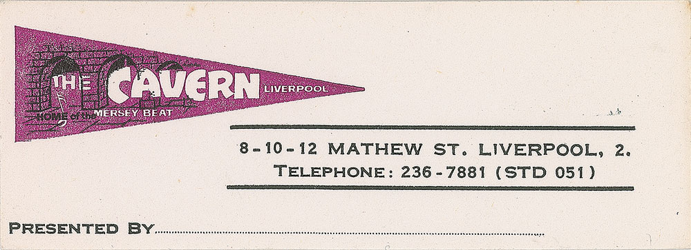 Original unissued circa 1960s Cavern Club business card, 4 x 1.5, listing address and telephone number, with the Cavern Club pennant to left side. In fine condition.