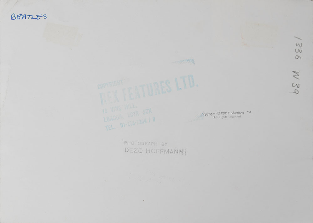 Modern glossy 10 x 7 photograph of George Harrison and Ringo Starr from an original negative by photographer Dezo Hoffman, taken outside Liverpool?s Cavern Club on August 30, 1963. Stamped on the reverse by Dezo Hoffman, Rex Features Ltd., and RDR Productions. In fine condition, with slight trimming and a few light creases.