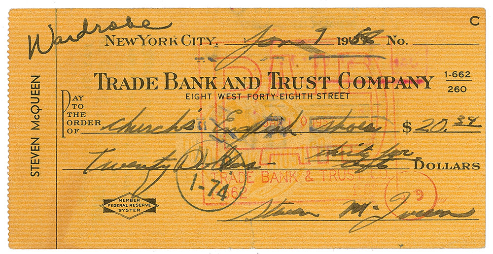 Scarce personal check, 5.5 x 2.75, filled out and signed by McQueen, “Steven McQueen,” payable to Church’s English Shoes for $20.34, January 9, 1957. A notation in another hand reads, “Wardrobe.” In fine condition, with some brushing to ink. It was not until the next year that McQueen was credited in his first feature films—first in the noir gangster film Never Love a Stranger, followed by his debut as a leading man in the B-movie classic The Blob. A very early example in an uncommon format. Pre-certified PSA/DNA.