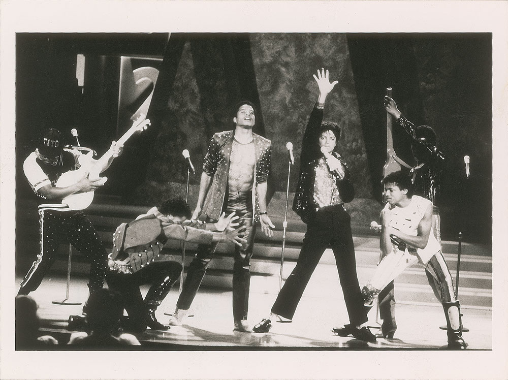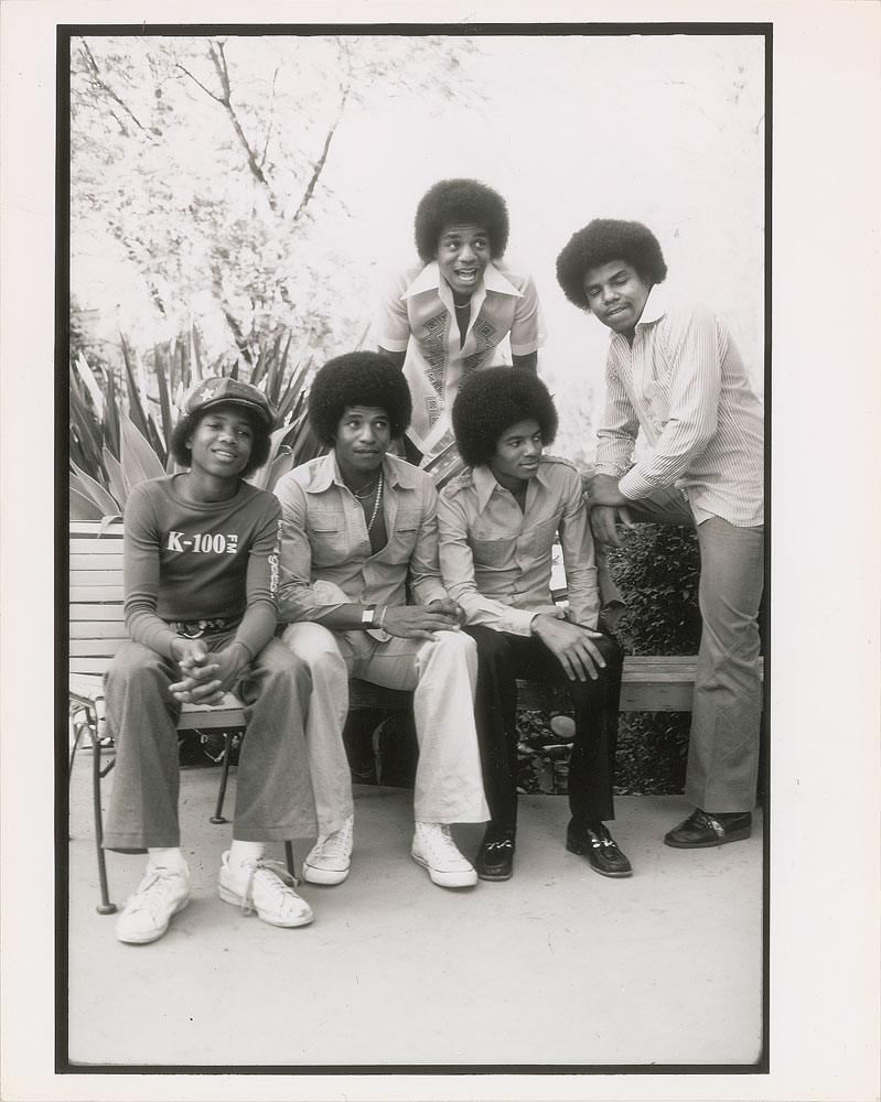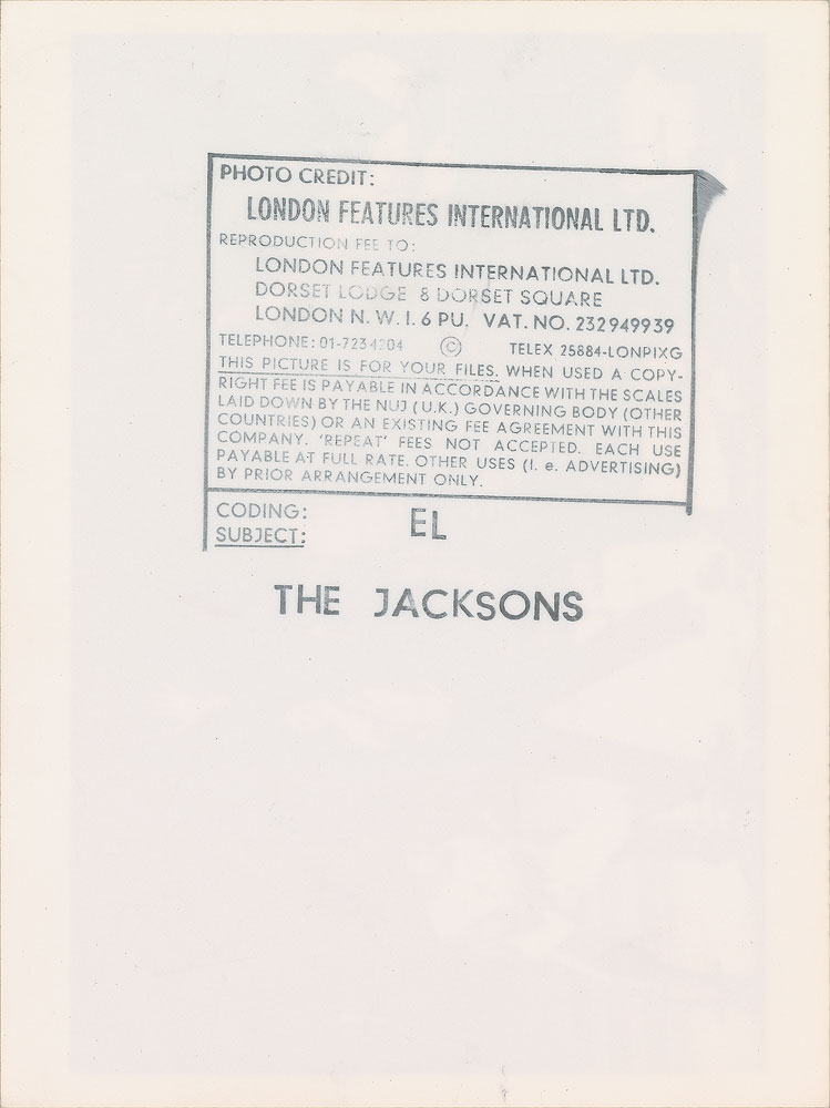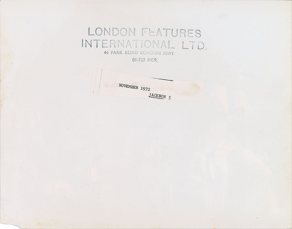 Three original vintage glossy silver gelatin photos of the Jackson Five, including: an 8 x 10 photo of the group posing on a park bench; a 10 x 8 photo of the Jackson Five performing on stage, dated 1972 on the reverse; and an 8 x 6 photo of The Jacksons performing in later years. All bear London Features International Ltd. labels on the reverse. In overall very good to fine condition, with scattered creasing and an absent lower right corner tip to the 10 x 8 photo.