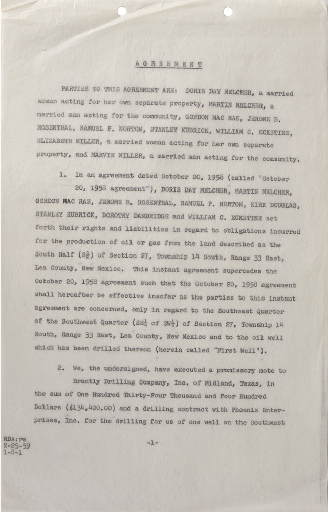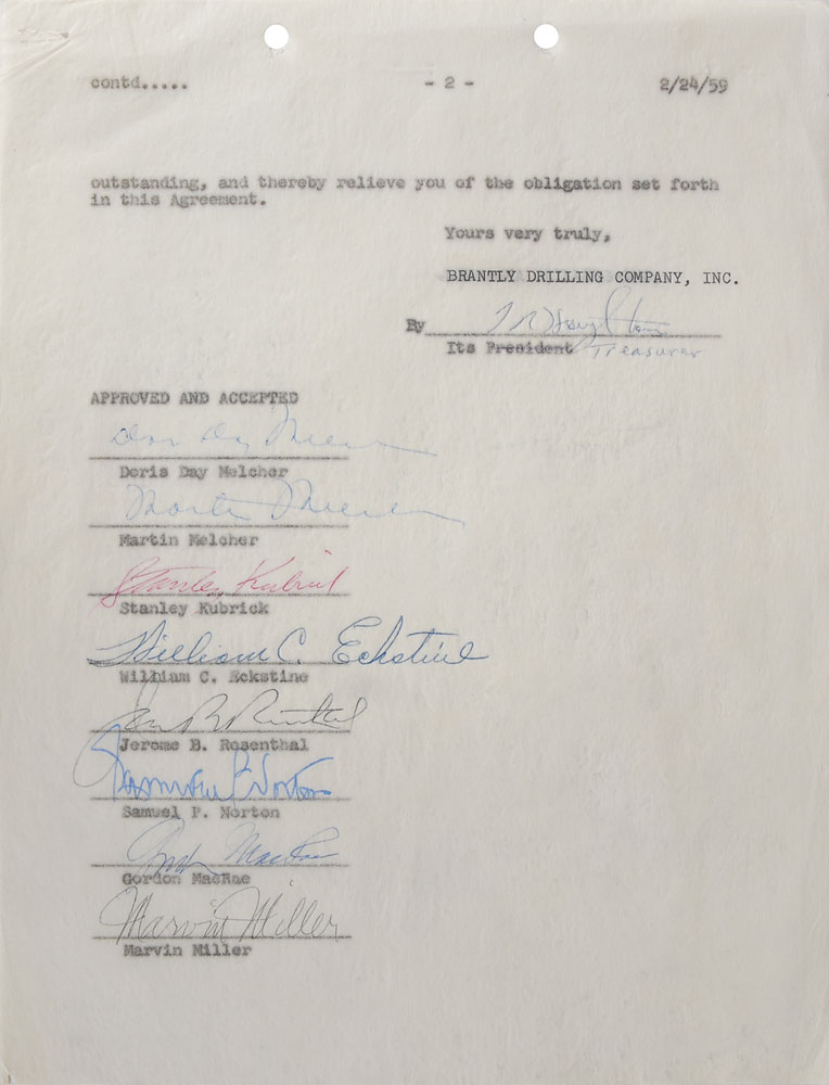 DS, two pages, 8.5 x 11, October 20, 1958. Agreement with the Brantly Drilling Company in which a certain partnership “set forth their rights and liabilities in regard to obligations incurred for the production of oil or gas from…Lea County, New Mexico.” Signed on the last page in red ballpoint by Kubrick. Also signed by Martin Melcher, Doris Day Melcher, Marvin Miller, William C. Eckstine, Jerome B. Rosenthal, Samuel P. Norton, and Gordon MacRae. In very good to fine condition, with light creasing o the top of the first page. Pre-certified PSA/DNA.