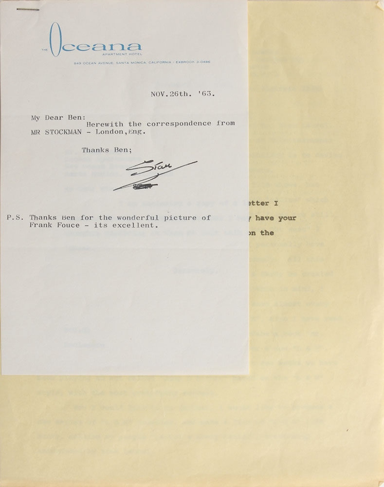 TLS signed "Stan," one page, 5.5 x 8.5, Oceana Apartment Hotel letterhead, November 26, 1963. Letter to Ben Shipman, in full: "Herewith the correspondence from Mr. Stockman-London, Eng." Laurel adds a typed postscript, "Thanks Ben for the wonderful picture of Frank Fouce-its excellent." Stapled to the letter are copies of the referenced correspondence, which relates to Stockman's desire to produce a new series of Laurel and Hardy comedies. In fine condition.