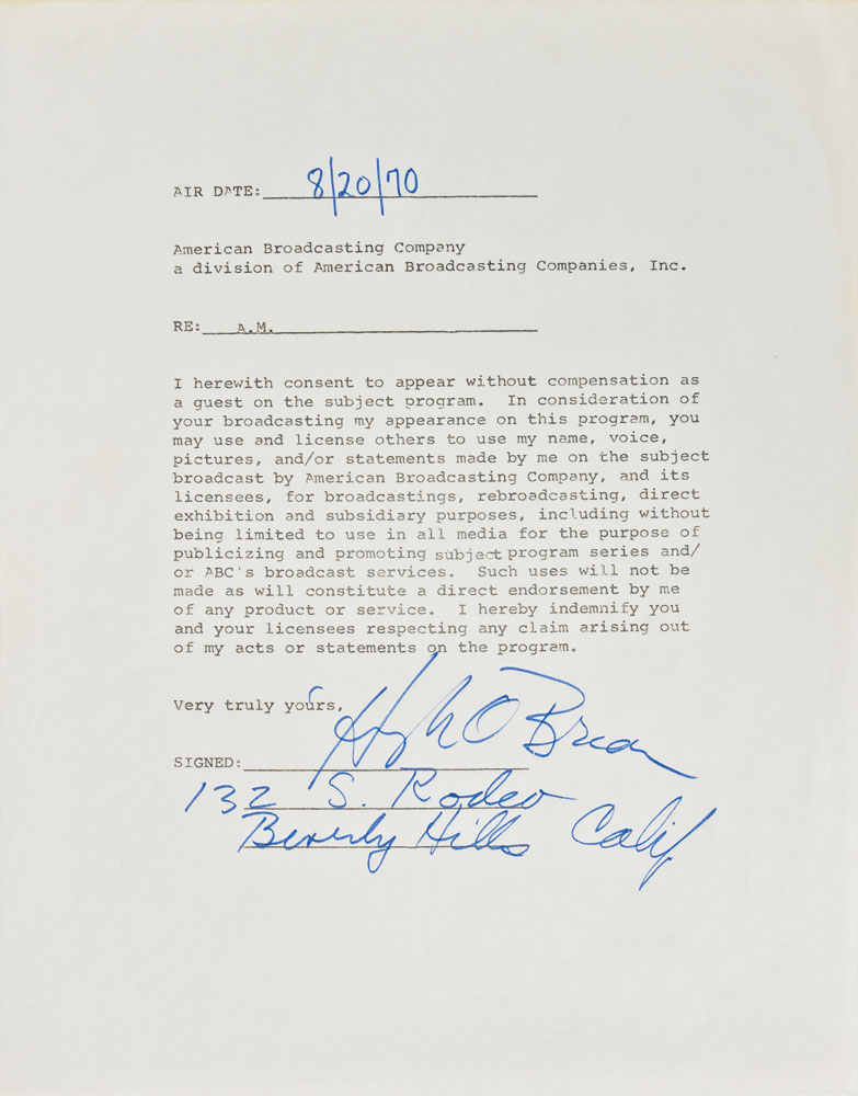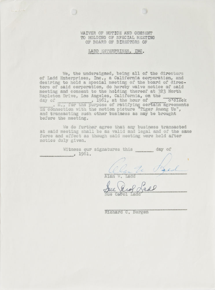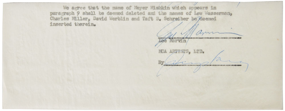 Three documents, each signed by a Western star, including: a partial agreement with MCA Artists, signed in blue ballpoint by Lee Marvin; a waiver of notice and consent to holding of special meeting of Ladd Enterprises board directors, signed in blue ballpoint by Alan Ladd; and a contract with the American Broadcasting Company, signed in blue ink by Hugh O'Brien. In overall fine condition.