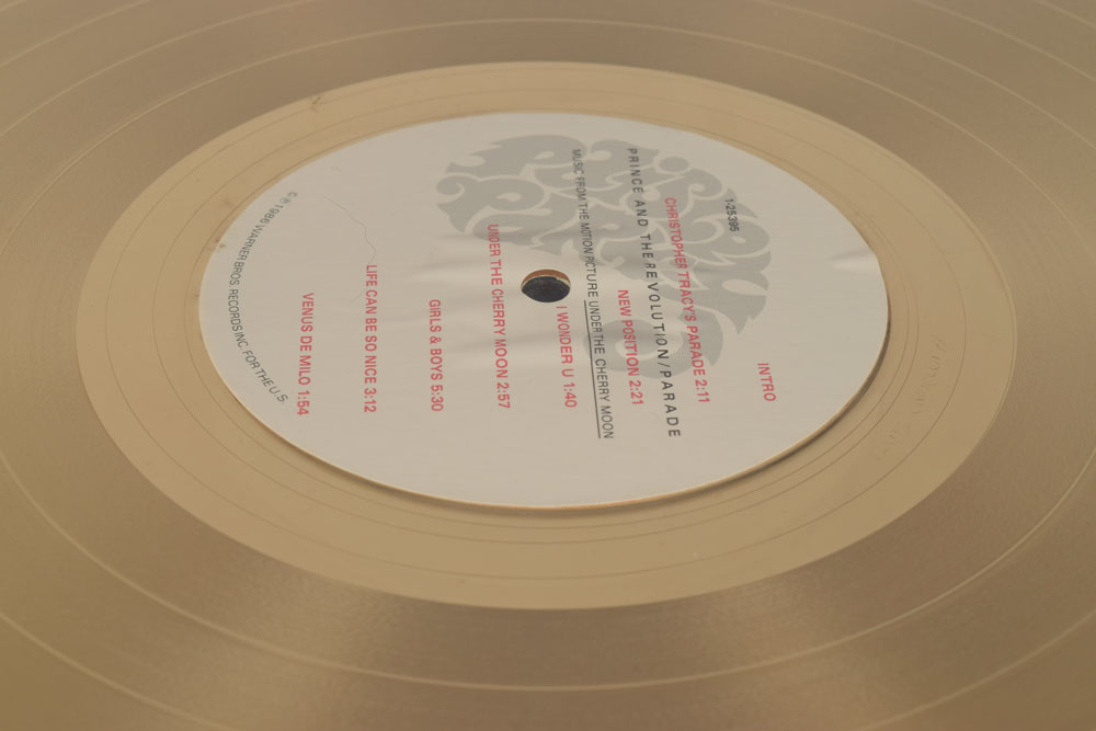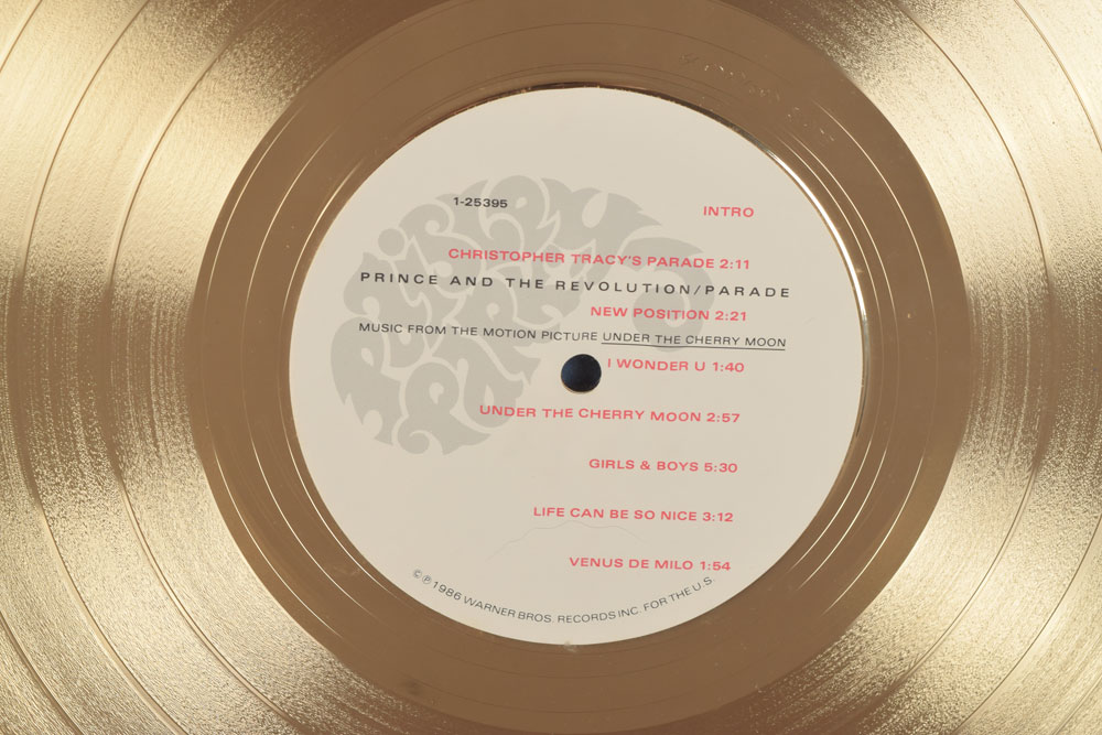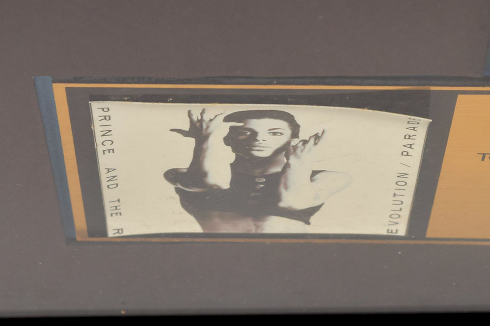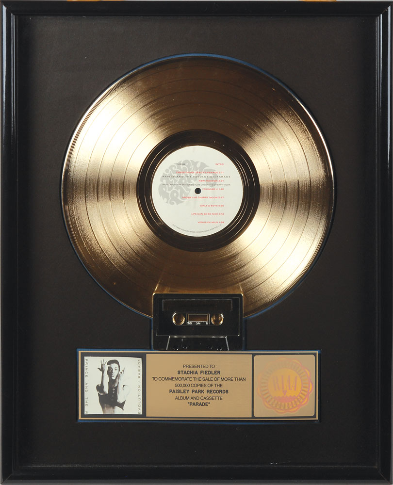 Official RIAA flower hologram-style gold sales award presented "to Stachia Fiedler to commemorate the sale of more than 500,000 copies of the Paisley Park Records album and cassette 'Parade.'" Framed with a disc, cassette, and plate bearing a small image of the album cover to an overall size of 17 x 21. Award retains its original backing with a Fitzgerald Hartley Marketing label, but it has opened and re-stapled to the frame. In very good to fine condition, with apparent repairs, including rippling to the label on the disc, the album cover image peeling, and non-original platinum cassette used in the display; it seems that this award may have been damaged pieced together from other parts. From the collection of Prince's assistant Stachia Fiedler.