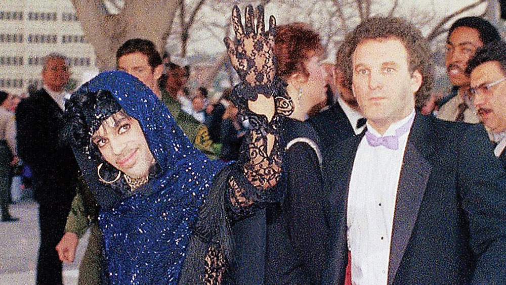 Prince's personally-owned and -worn Purple Rain-era black lace gloves, each measuring 9? long, accompanied by an image of him wearing the gloves. In fine condition. From the collection of Prince’s assistant Stachia Fiedler. A distinctive piece of Prince's wardrobe. Accompanied by a letter of provenance from Stachia Fielder.
