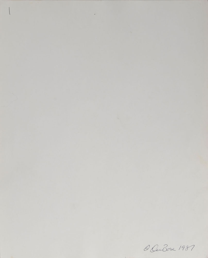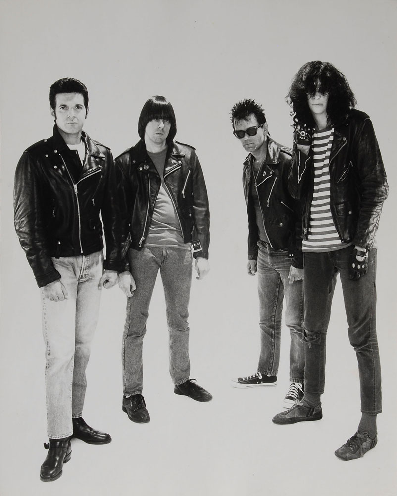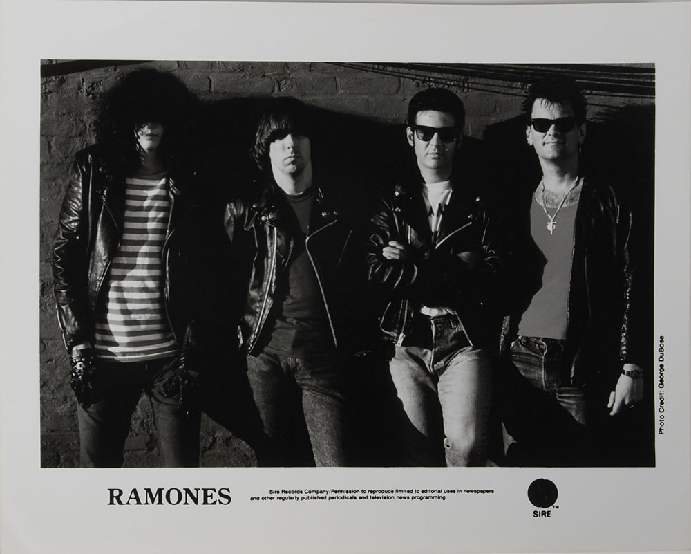 Circa 1987 8 x 10 silver gelatin photo of the Ramones in a full-length group pose by photographer George DuBose, signed on the reverse in black ballpint, "DuBose 1987." In fine condition, with some scattered light surface creases. Accompanied by an unsigned glossy 10 x 8 Sire Records publicity photo of the Ramones, also featuring Clem Burke in the lineup as Elvis Ramone. From The Monte A. Melnick Ramones Collection.