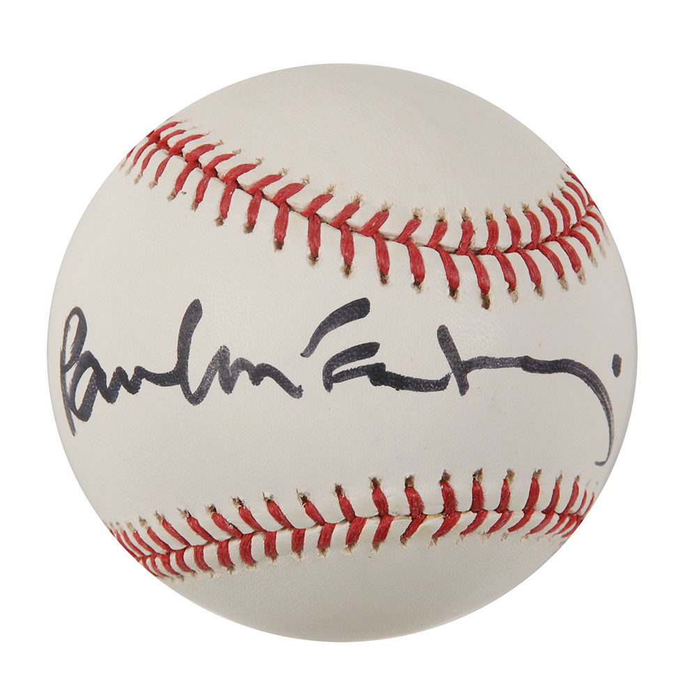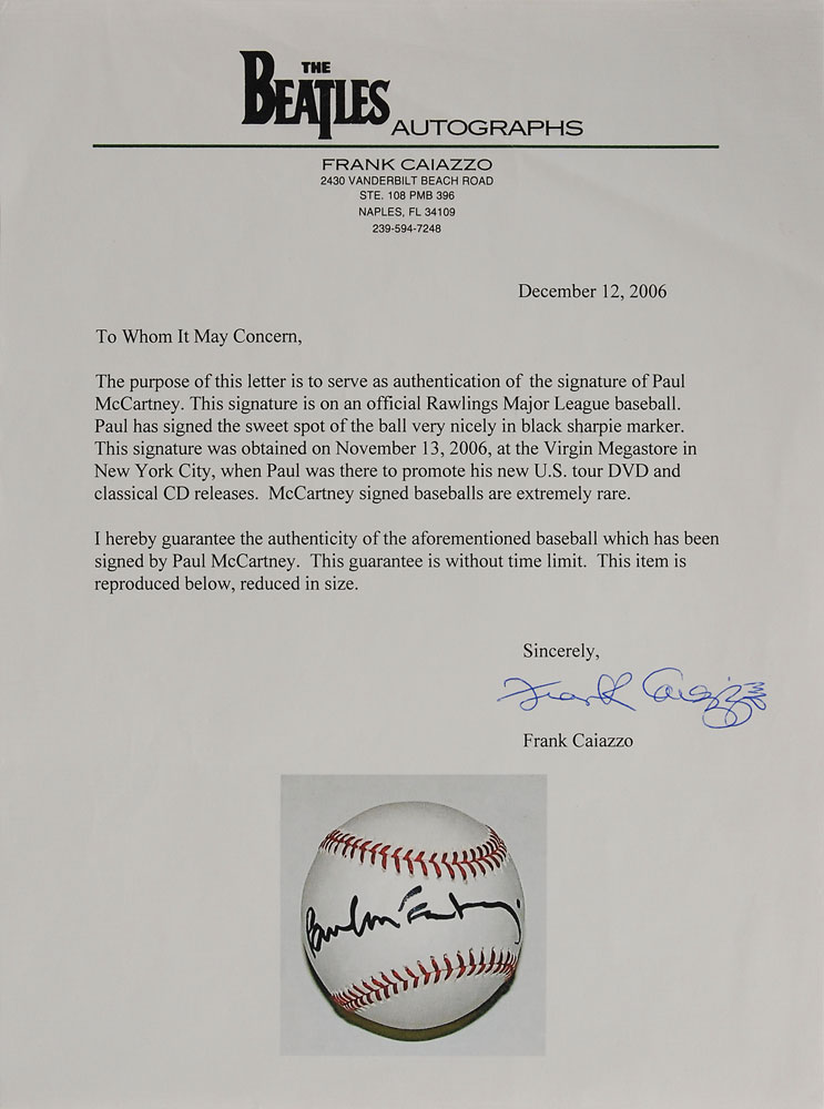 Official Rawlings Major League baseball prominently signed in black felt tip on the sweet spot, "Paul McCartney." In fine condition. Accompanied by a letter of authenticity from noted Beatles expert Frank Caiazzo, in part: "This signature was obtained on November 13, 2006, at the Virgin Megastore in New York City, when Paul was there to promote his new U.S. tour DVD and classical CD releases. McCartney signed baseballs are extremely rare." Pre-certified REAL.