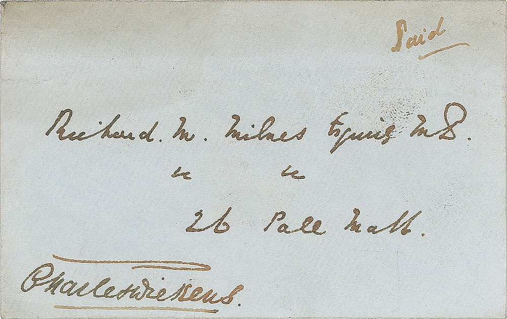 Hand-addressed mailing envelope, 4.75 x 2.75, addressed by Dickens to ?Richard M. Milnes Esquire M. D., 26 Pall Mall,? and signed in the lower left, ?Charles Dickens.? In fine condition, with a light horizontal crease above the address. Milnes was an English poet, patron of literature and politician, who was a one-time member of Parliament and the famous Apostles Club. Pre-certified PSA/DNA.