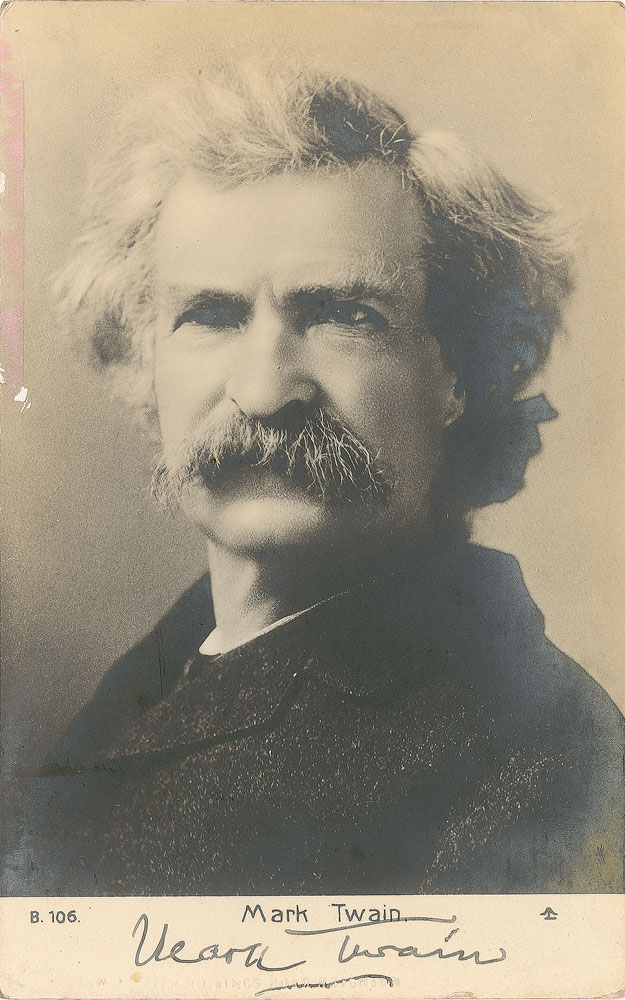 Very desirable vintage matte-finish 3.5 x 5.5 postcard photo of Clemens in a handsome head-and-shoulders pose, signed in the lower border in fountain pen, "Mark Twain." In very good condition, with moderate overall silvering, and a bit of old mounting reside and fleck of emulsion loss along the left edge. Pre-certified PSA/DNA.