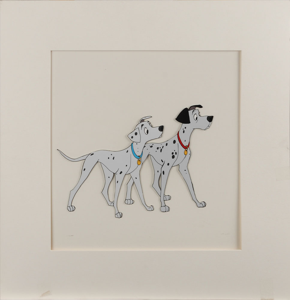 Unique grouping of items related to the Disney classic 101 Dalmatians, highlighted by a green loose-leaf binder from the estate of Disney employee Ken Anderson. The binder is annotated in black felt tip, "Searle's Sketches of London," signed on the inside front cover by Anderson, and contains sixty-two glossy photos, 8 x 10 and 10 x 8, each featuring drawings of London settings and citizens by artist Ronald Searle, stamped on the reverse, "Source: Ronald Searle's—Looking at London, 101 Dalmatians" and "Important! Please return to Walt Disney Studio Library." Also included is a hardcover first edition of The Hundred and One Dalmatians, with original dust jacket; and an original production cel of Pongo and Perdita from 101 Dalmatians, depicting the two dogs in a state of alertness, with image measuring 9.25 x 6.75, with a mat opening of 11.25 x 11.5. In overall fine condition. Anderson worked at Disney for forty-four years and made key contributions to Snow White and the Seven Dwarfs, Pinocchio, and The Jungle Book. Anderson was responsible for the art direction and production design for film adaptation of 101 Dalmatians, which was released in 1961.