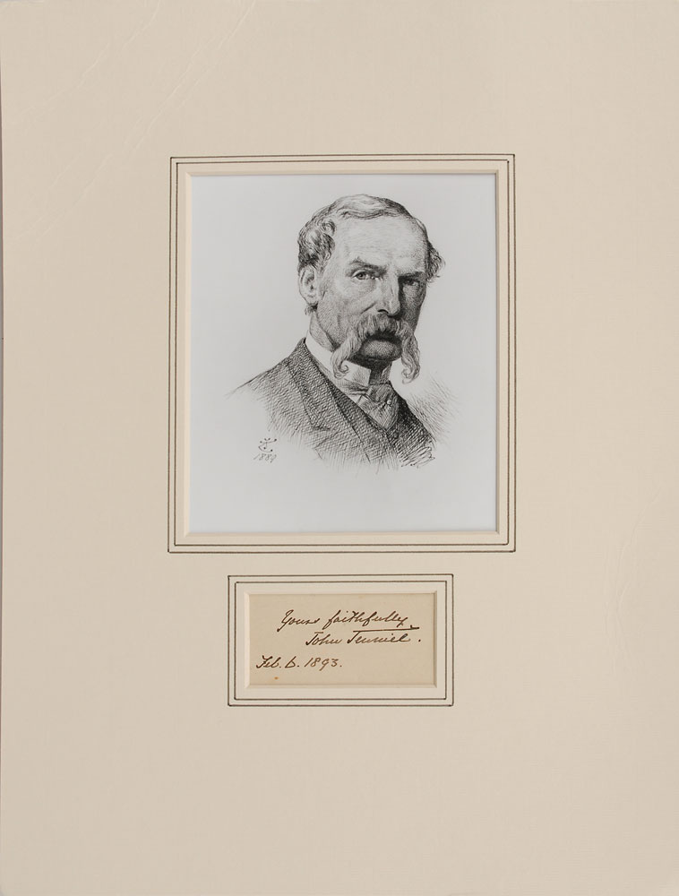 British illustrator (1820-1914) best known for his collaborations with Lewis Carroll on the Alice in Wonderland books. Scarce ink signature, "Yours faithfully, John Tenniel, Feb. 6, 1893,” on an off-white 3 x 1.5 card. Matted with an image of the artist to an overall size of 10.75 x 15.25. In fine condition.
