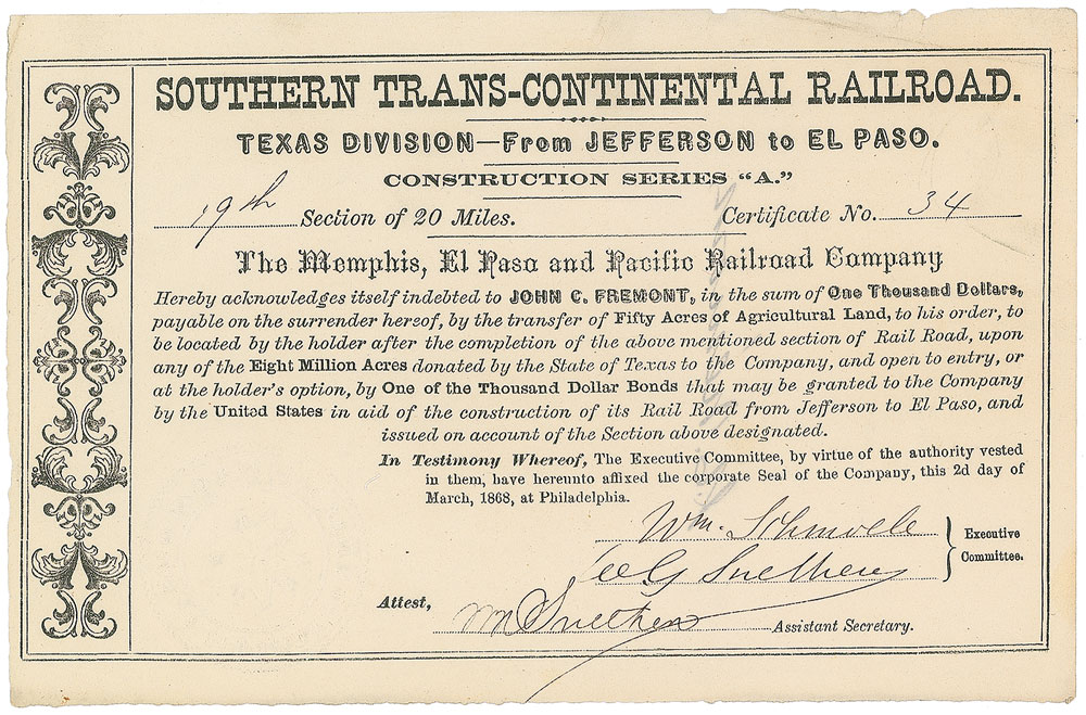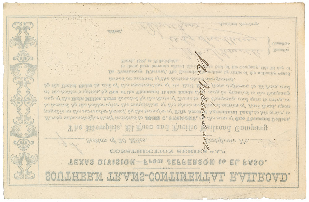 Prominent American explorer, military officer, and politician (1813-1890). Endorsement signature, “J. C. Fremont,” on the reverse of a partly-printed document, one page, 7.75 x 5, March 2, 1868. A bond headed “Southern Trans-Continental Railroad, Texas Division—From Jefferson to El Paso, Construction Series ‘A,’” in which the “Memphis, El Paso and Pacific Railroad Company… acknowledges itself indebted to John C. Fremont, in the sum of One Thousand Dollars.” Embossed with an official company seal to the lower left. In fine condition.