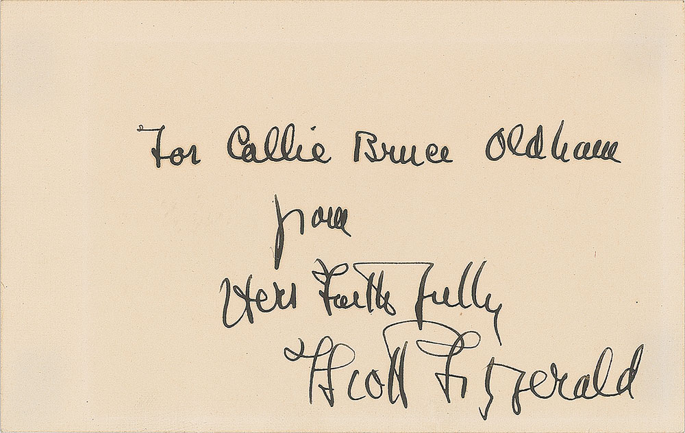 Rare ink signature and inscription, "For Callie Bruce Oldham, from, Hers faithfully, F. Scott Fitzgerald,? on an off-white 5 x 3 card. In fine condition, with a very faint block of light toning from prior display. Pre-certified PSA/DNA.