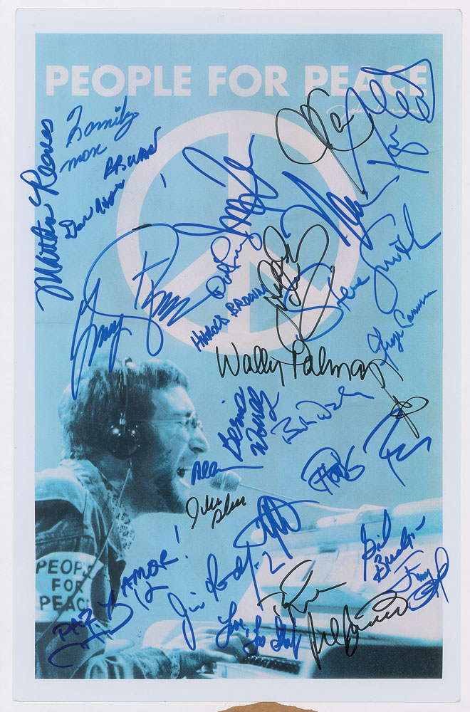 Color satin-finish 11 x 17 'People for Peace' photo honoring John Lennon, signed in blue and black felt tip by the following: Journey including Neal Schon, Ross Valory, Steve Smith, and Jonathan Cain; Martha Reeves of Martha & the Vandellas; Kenny Loggins; Aston ‘Family Man’ Barrett and Al Anderson of The Wailers; Jim McCardy of The Yardbirds; Christopher Cross; Bob Welch of Fleetwood Mac; Tommy Chong of Cheech & Chong; Chuck Panozzo of Styx; Gil Bridges of Rare Earth; David Freiberg of Quicksilver Messenger Service; B. B. Dickerson and Harold Brown of War; Little Feat including Bill Payne and Paul Barrere; Steve Fossen of Heart; Dave Hope of Kansas; Al Anderson of The Wailers; Al DiMeola of Return to Forever; Jules Alexander of The Association; Gino Vannelli; Carl Giammarese of The Buckinghams; Bernie Worrell of P-Funk; George Cameron of The Left Banke; Roger Earl of Foghat; Ian Matthews of Fairport Convention; Garry Peterson and Jim Kale of The Guess Who; Lee Soloff of Blood, Sweat & Tears; John McEuen of Nitty Gritty Band; Jimmy Osmond of The Osmonds; Jim Rodford of The Kinks; Wally Palmar of The Romantics; and Tina Weymouth of Talking Heads. In fine condition.