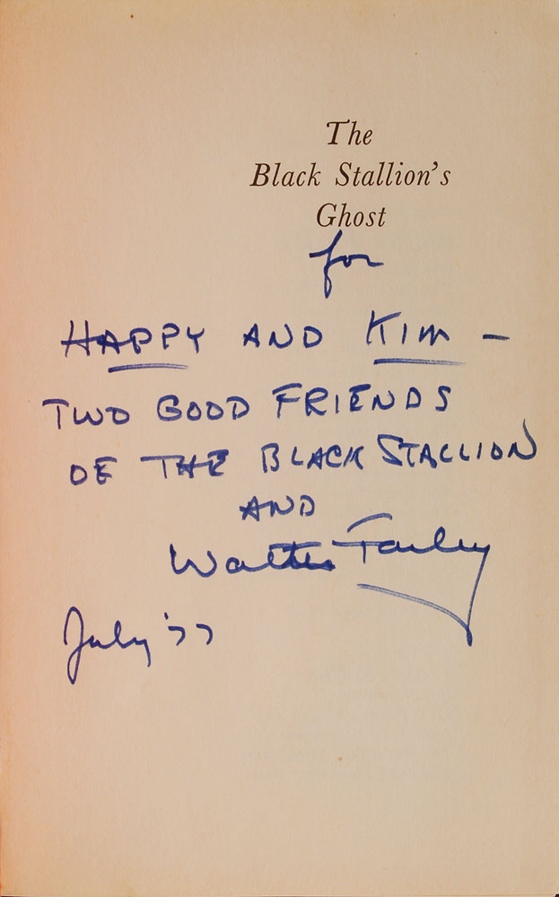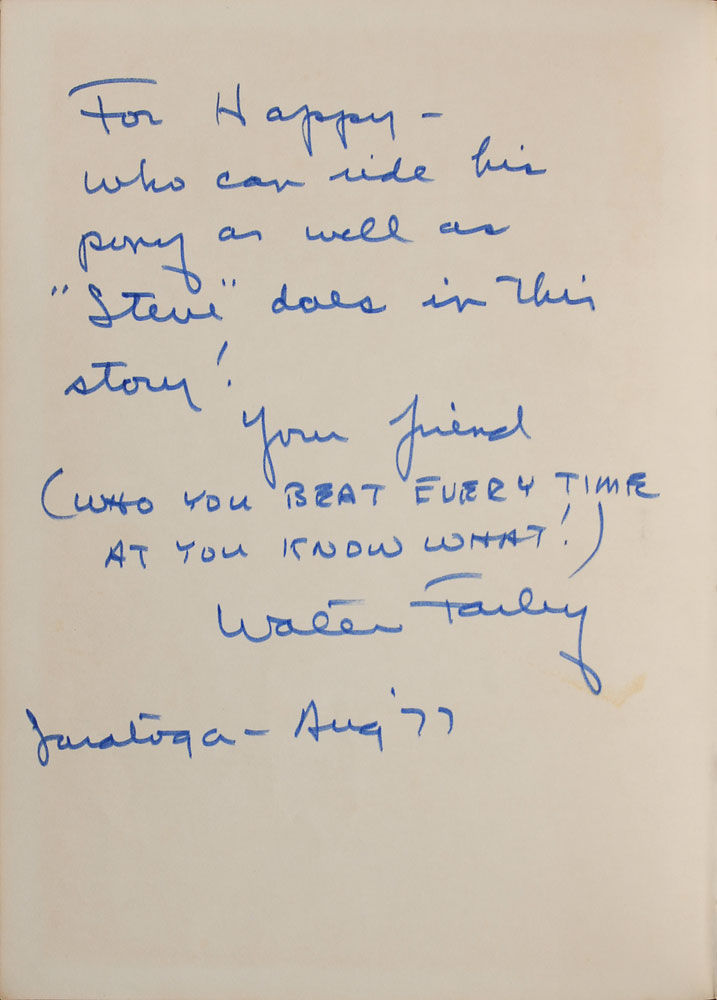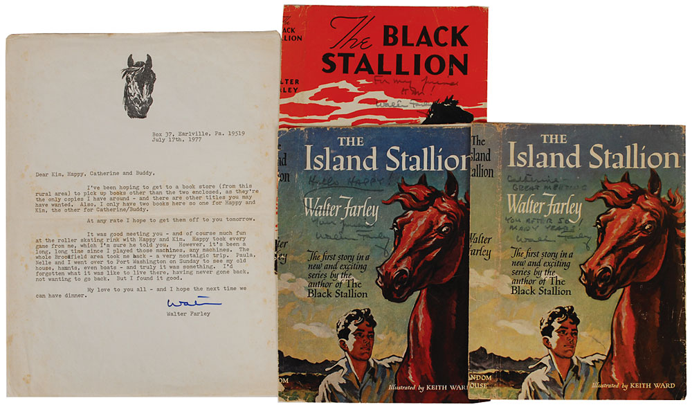 American author (1915?1989) known for his children's horse stories, best remembered for The Black Stallion. Collection of six items, including: a hardcover copy of The Black Stallion's Ghost, signed and inscribed on the half-title page in felt tip; a hardcover copy of The Little Black Pony Races, lengthily signed and inscribed opposite the title page in felt tip; three dust jackets for books by Farley, each signed and inscribed on the front in felt tip; and a TLS by Farley, one page, July 17, 1977. In overall very good to fine condition, with wear and creasing to the loose dust jackets, and moderate foxing to the letter. Accompanied by a letter of provenance from the original recipient, who describes meeting and befriending Farley in the late 1970s.