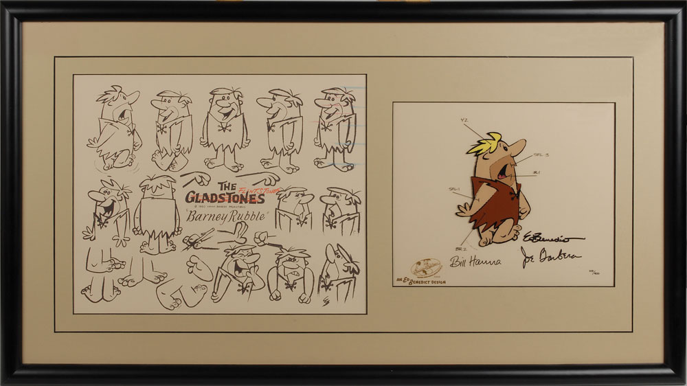 Limited edition hand-painted cel depicting the Flintstones character Barney Rubble, numbered 105/400, 12 x 10, signed in black felt tip by Bill Hanna, Joe Barbera, and Ed Benedict. Impressively matted and framed with a print portraying the initial 'Gladstones' concept artwork to an overall size of 38 x 21. In fine condition. Pre-certified PSA/DNA.