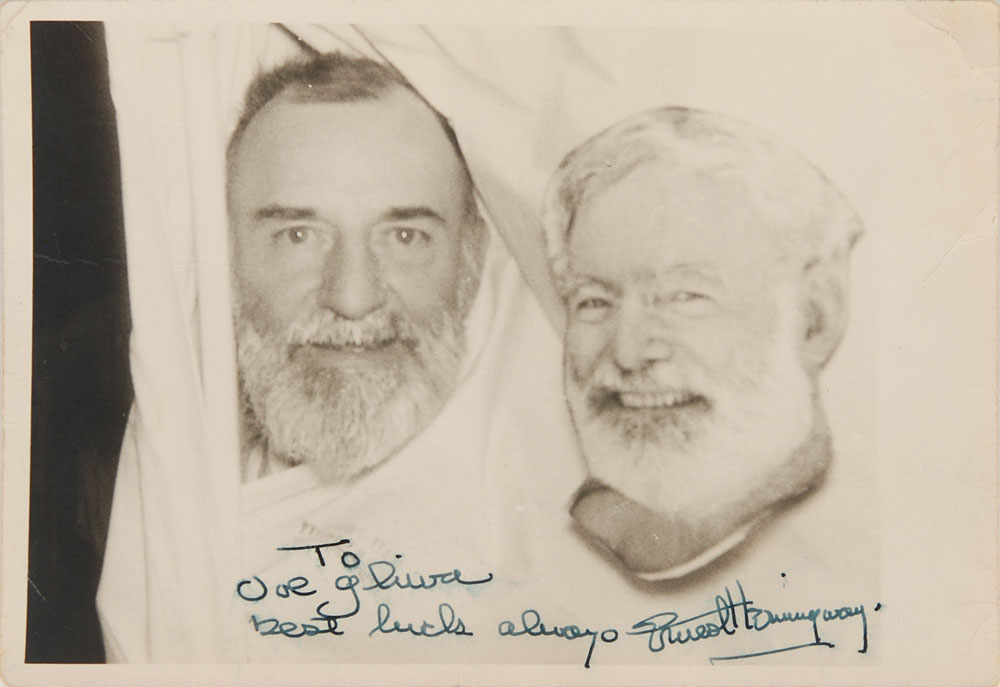 Unusual vintage matte-finish 7 x 5 photo of a man posing with a cutout portrait of Hemingway, signed and inscribed in fountain pen, "To Joe Gliwa, best luck always, Ernest Hemingway.? In very good to fine condition, with scattered creasing, and light brushing to the handwriting. Gliwa, pictured here in the photo, is seen lying in a bed at St. Mary's Hospital in Rochester, Minnesota, in May of 1961, less than two months before Hemingway's suicide. Accompanied by a mailing envelope and original letter of receipt from Gliwa, as well as a full letter of authenticity from JSA. Pre-certified PSA/DNA.