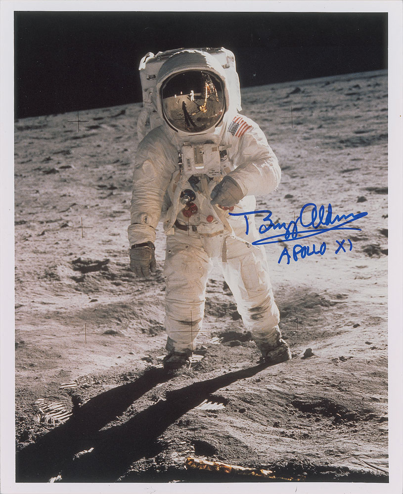 Iconic color semi-glossy 8 x 10 full-length photo of Aldrin standing on the lunar surface, his visor showing the reflection of photographer Neil Armstrong, signed in blue felt tip, "Buzz Aldrin, Apollo XI." In very fine condition.