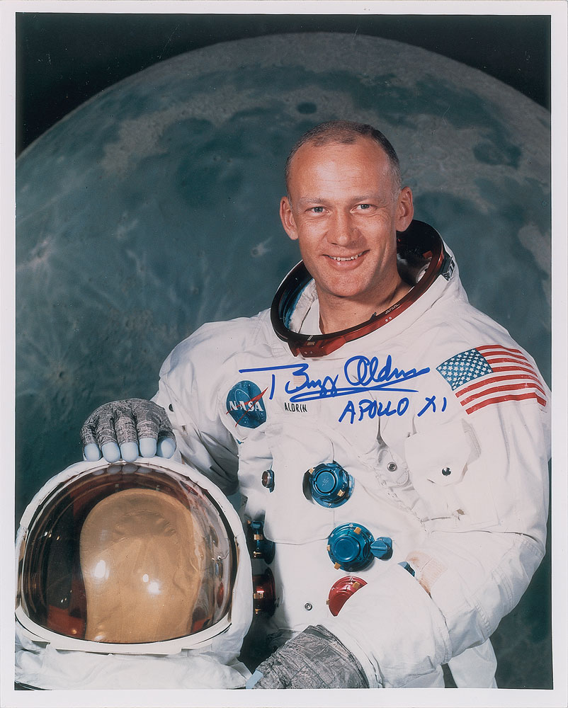 Color semi-glossy 8 x 10 photo of history's second moonwalker proudly posing in his white space suit against a lunar backdrop, signed in blue felt tip, "Buzz Aldrin, Apollo XI." In very fine condition.