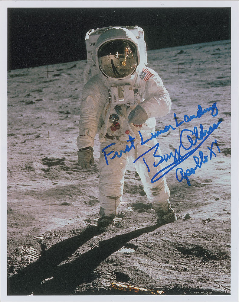 Color satin-finish 8 x 10 full-length photo of Aldrin standing on the surface of the moon, signed in blue felt tip, "First Lunar Landing, Buzz Aldrin, Apollo XI." In very fine condition.