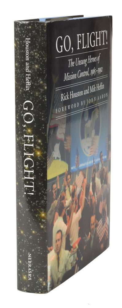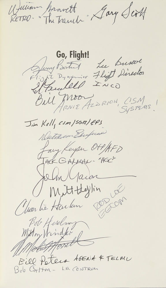Signed book: Go, Flight!. First edition. Lincoln, NE: University of Nebraska, 2015. Hardcover with dust jacket, 6.25 x 9.25, 341 pages. Signed on the half-title page in black ink and ballpoint by 20 members of NASA’s mission control, including: Lee Briscoe, Bill Moon, Arnie Aldrich, Milton Windler, Bill Peters, Jim Kelly, Gary Scott, and Milt Heflin. In fine condition.