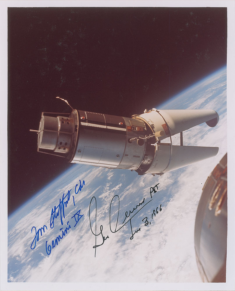Uncommon color glossy 8 x 10 photo of the rendezvous with the Augmented Target Docking Adapter and its still attached payload fairing, which Commander Stafford described as an 'angry alligator,' signed in blue felt tip, "Tom Stafford, Cdr, Gemini IX," and in black felt tip, "Gene Cernan, PLT, June 3, 1966." In fine condition.