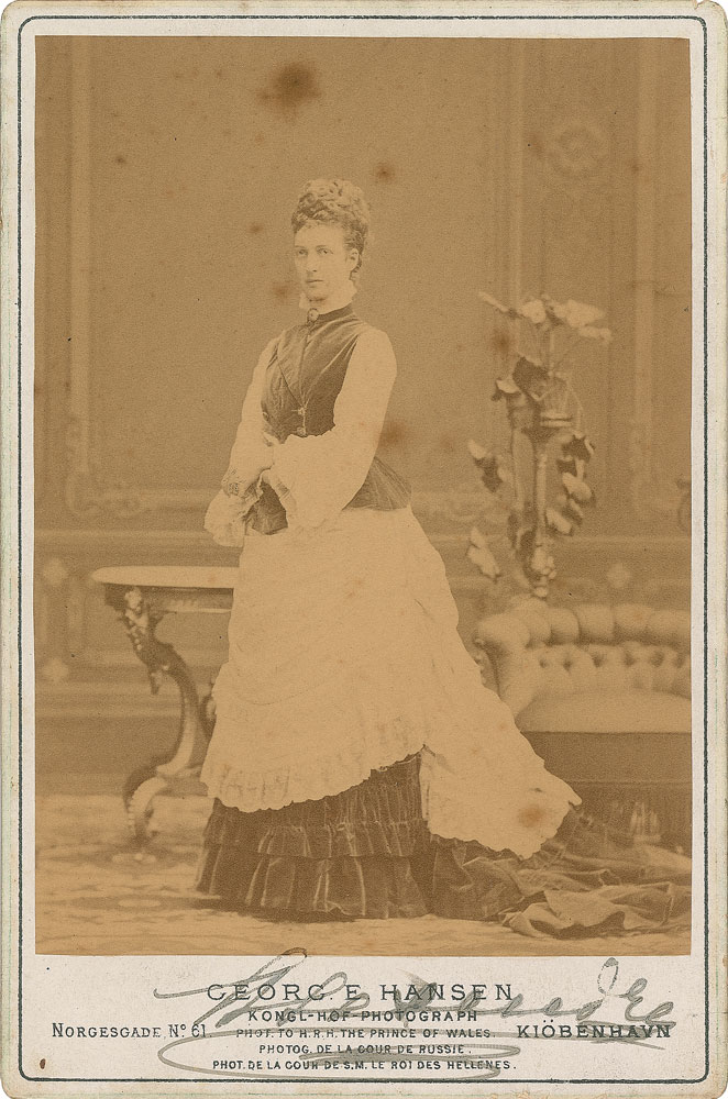 Exquisite 4.25 x 6.5 cabinet photo of Queen Alexandra in a full-length pose, signed in the lower border in black ink, "Alexandra." Published by Georg E. Hansen. In very good to fine condition, with some scattered light foxing.
