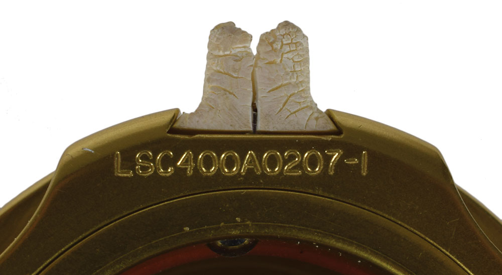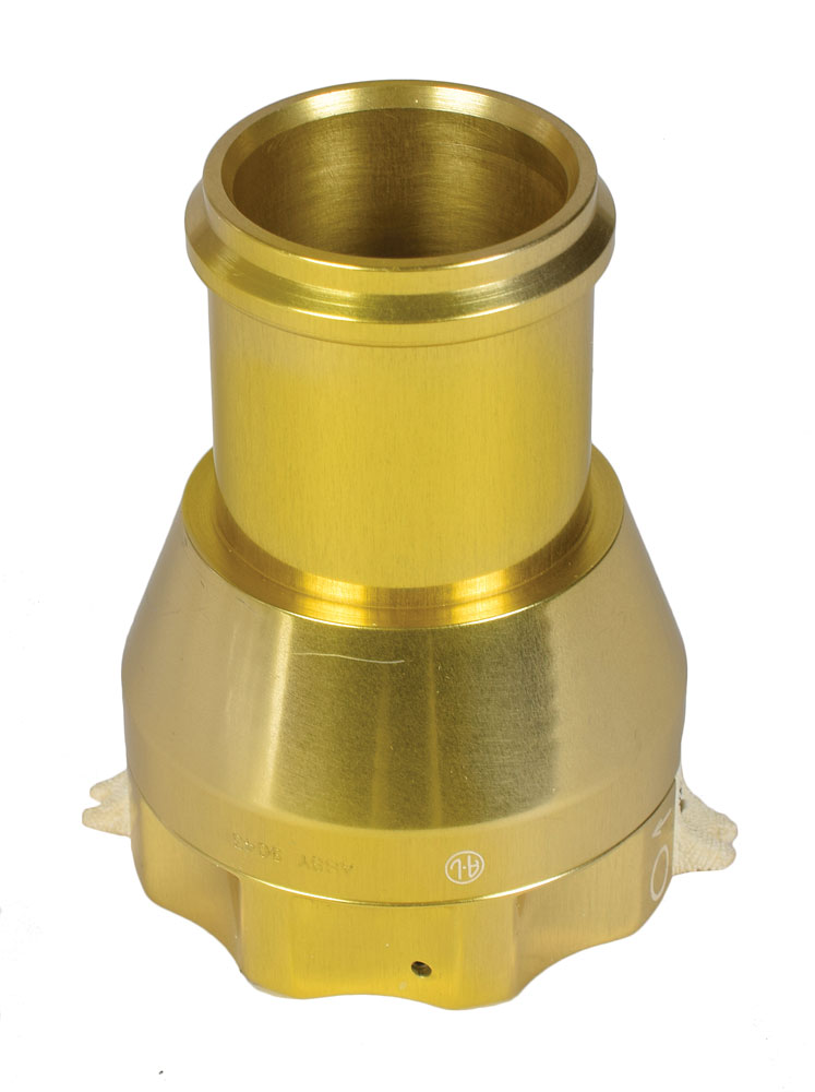 Gold anodized metal connector produced by Air-Lock to be compatible with the A7L space suit and utilized in conjunction with the Apollo Lunar Module, measuring 2″ in diameter and 2.75″ long, engraved with part numbers, "LSC400A0207-1, Assy 9043, SN-109." In fine condition.