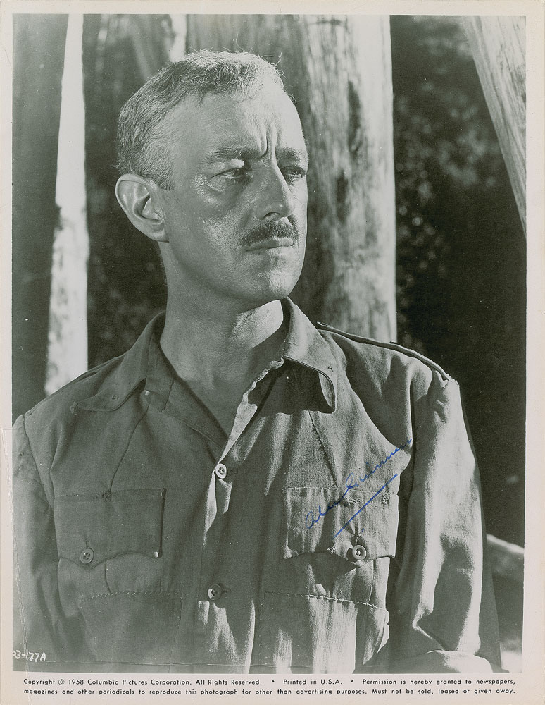 Vintage glossy 8 x 10 photo of Guinness as Lieutenant Colonel Nicholson in the 1957 classic The Bridge on the River Kwai, signed in fountain pen. In very good to fine condition, with scattered light creasing (heavier to lower left). Pre-certified Beckett Authentication Services.