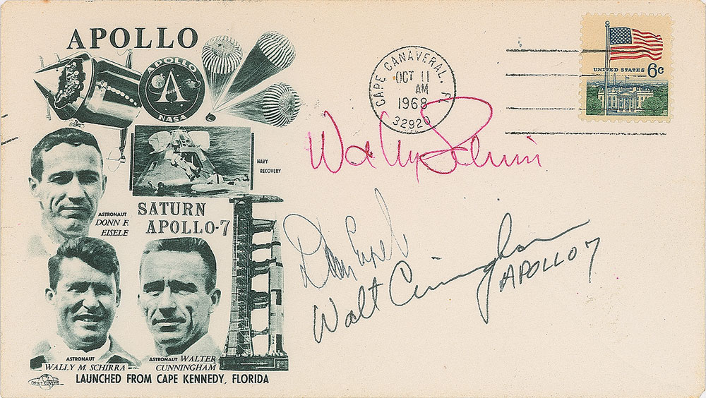 Apollo 7 launch day cover with a cachet honoring the mission, signed in ink, "Wally Schirra," "Donn Eisele," and "Walt Cunningham, Apollo 7." In fine condition, with tiny chip to extreme lower right corner tip. From the collection of aerospace memorabilia specialist Ken Havekotte.