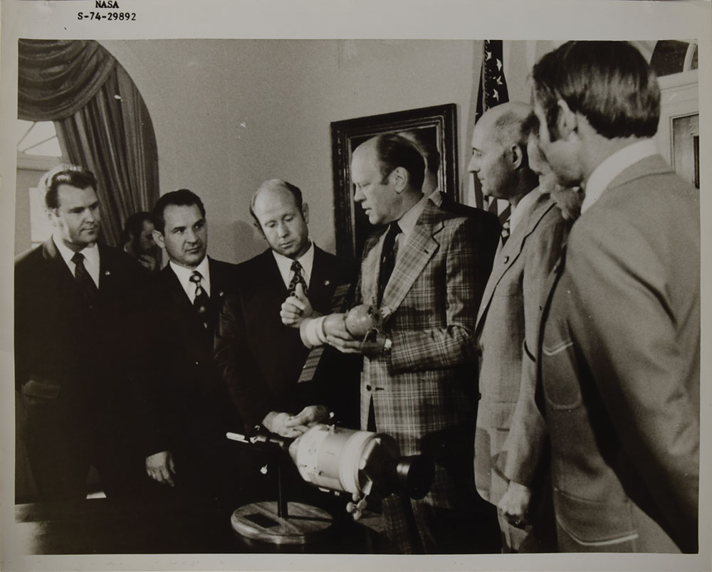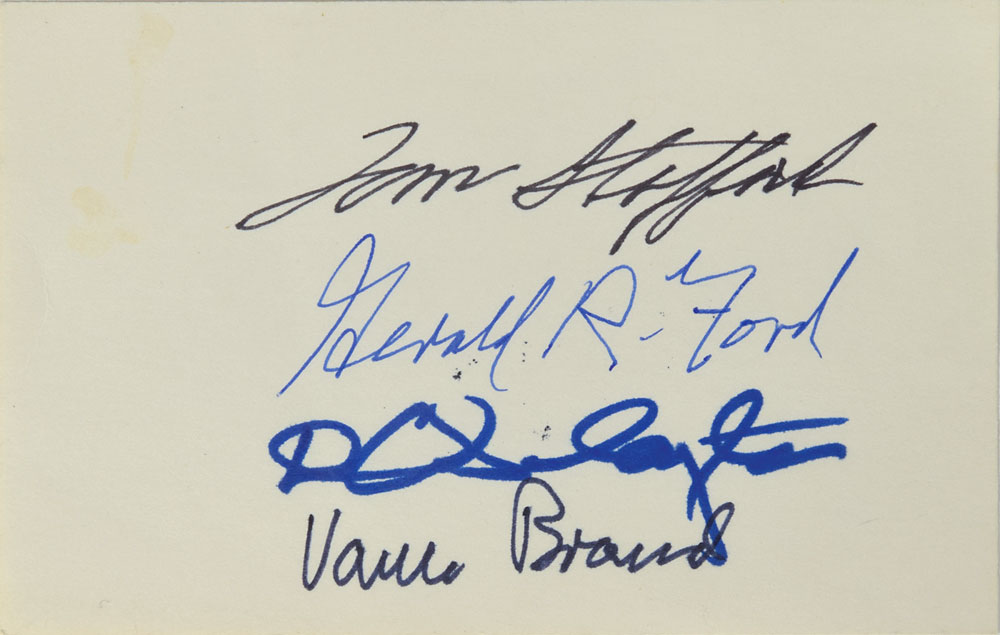 Two items: an official Apollo-Soyuz commemorative cover, signed in ink by President Gerald R. Ford, Deke Slayton, Tom Stafford, and Vance Brand; and felt tip signatures of Ford, Stafford, Slayton, and Brand on a white 5 x 3 card. In overall fine condition. Accompanied by an unsigned official black-and-white 10 x 8 NASA photo of Ford meeting with the ASTP astronauts at the White House. From the collection of aerospace memorabilia specialist Ken Havekotte.