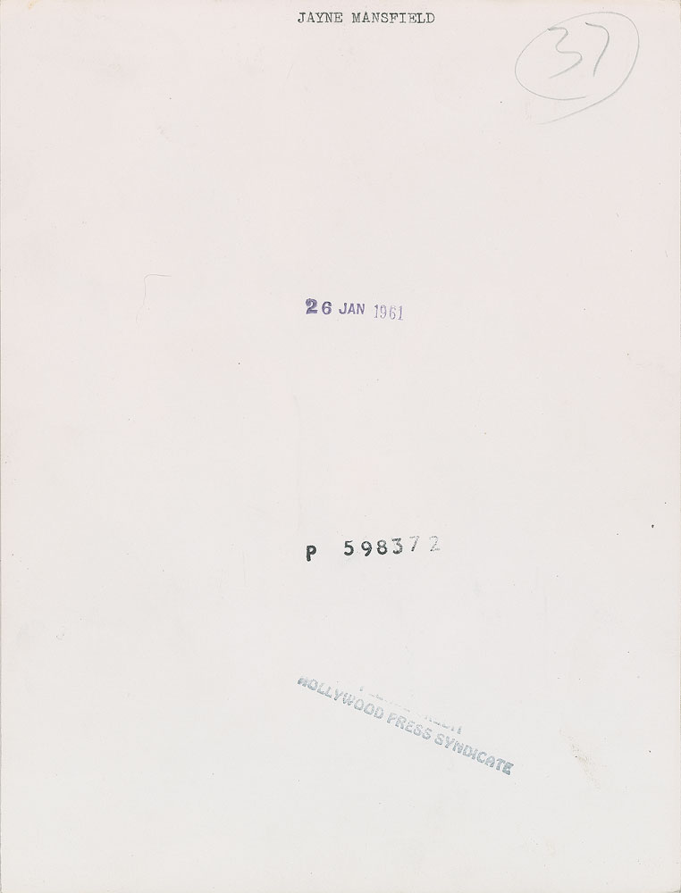 Original vintage glossy 7.25 x 9.5 photo of the busty Mansfield leaning against a wall in white shorts, stamp-dated January 26, 1961. Reverse also bears a Hollywood Press Syndicate credit stamp. In fine condition, with trimmed edges. From the Globe Photo archives.