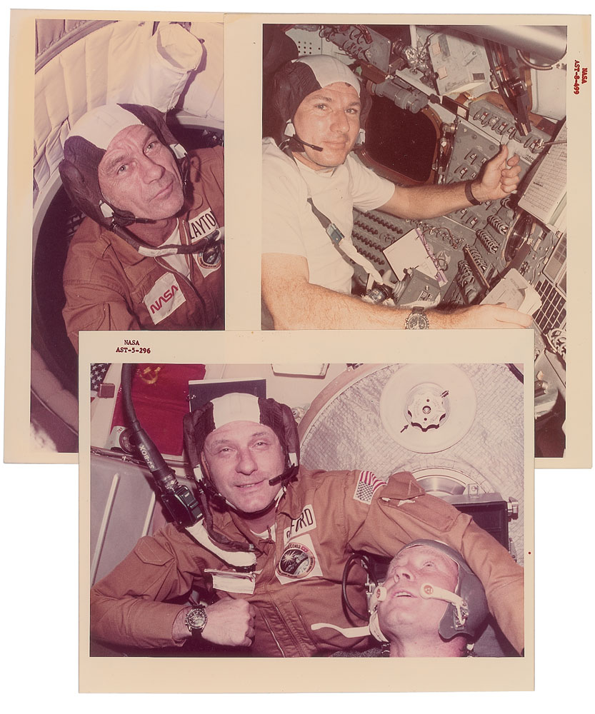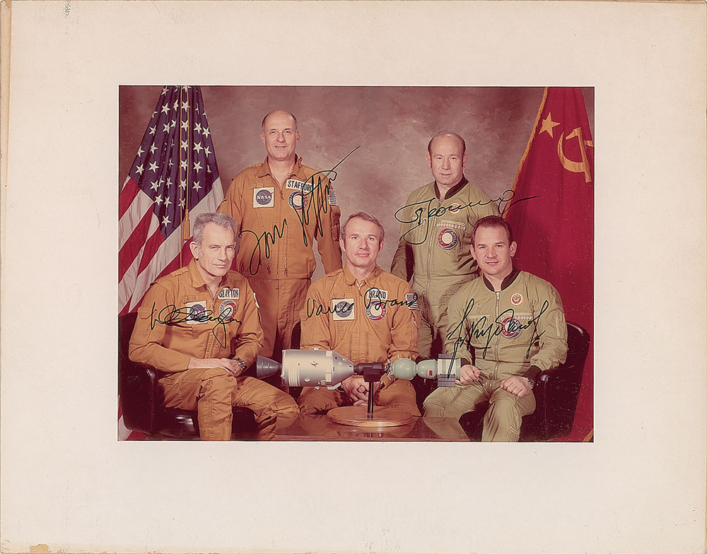 Color semi-glossy 9.5 x 7 photo of the Apollo-Soyuz crew, affixed to its original 14 x 11 mount, signed in thin black felt tip by Deke Slayton, Vance Brand, Tom Stafford, Valeri Kubasov, and Alexei Leonov. Reverse of mount stamped "S 75 22410." In fine condition. Accompanied by three unsigned vintage official color NASA red-numbered photos of the ASTP crew.