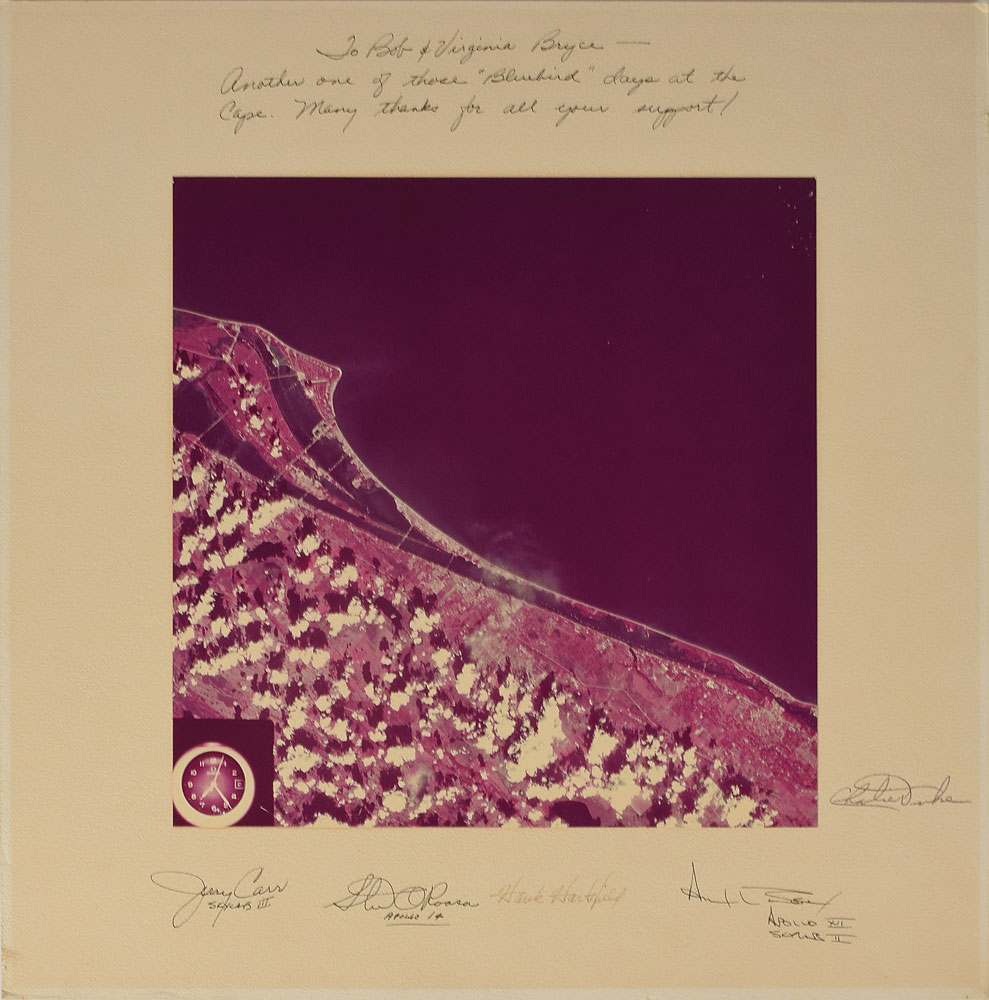 Scarce color semi-glossy 13 x 13 photo of Florida's Cape Canaveral from high above the Earth, affixed to the original 20 x 20 mount, signed in the lower border of the mount in black ink or felt tip, "Charlie Duke," "Alan L. Bean," "Hank Hartsfield," "Stu A. Roosa, Apollo 14," and "Jerry Carr, Skylab III," who adds the inscription to the upper border, "To Bob & Virginia Bryce—Another one of those 'Bluebird' days at the Cape. Many thanks for all your support!” Reverse of mount bears inks notations, "SL4-93-167." In fine condition, with a block of toning from previous display. A car dealer on Florida's Merritt Island during the early NASA programs, Bob Bryce often lent his cars to the wives of astronauts who were in town to watch launches at the nearby Kennedy Space Center.