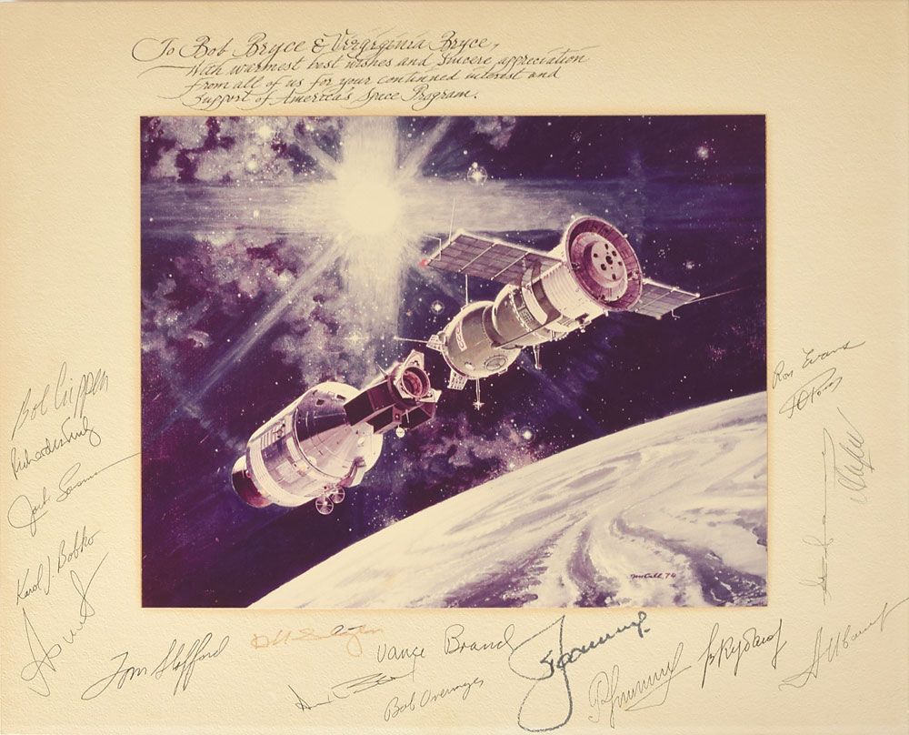Desirable color semi-glossy 13.75 x 10.75 photo of artist Robert McCall’s stunning painting of the moment of docking between the Apollo and Soyuz spacecrafts, affixed to the original 20 x 16 mount, calligraphically inscribed in the upper border of the mount, "To Bob Bryce and Virginia Bryce, with warmest best wishes and sincere appreciation from all of us for your continued interest and support of America's Space Program,” and signed around the borders in black ink and felt tip by 18 astronauts and cosmonauts, including: Alan Bean, Karol J. Bobko, Vance Brand, Bob Crippen, Valeri Kubasov, Alexei Leonov, Jack Lousma, Bob Overmyer, Ron Evans, Deke Slayton, Tom Stafford, Richard Truly, and six others. Reverse bears ink notations, "S-74-24913." In fine condition, with toning from previous display. A car dealer on Florida's Merritt Island during the early NASA programs, Bob Bryce often lent his cars to the wives of astronauts who were in town to watch launches at the nearby Kennedy Space Center.